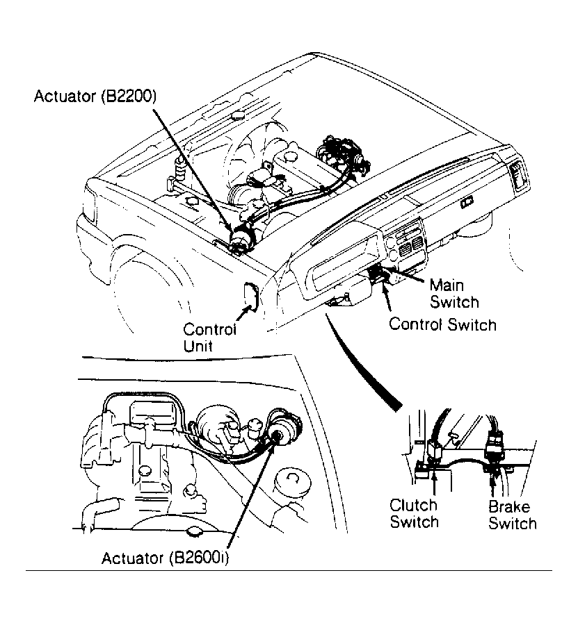 The control switch is located on the steering column or steering wheel. SeeFig 1 -6. The main switch must be on for the control switch to function. When SET is pressed and then released, desired speed is set in the memory of the control unit. To accelerate from a set cruising speed, turn control switch to ACCEL position or depress ACCEL button. On RX7 models, hold SET button down to accelerate from a set speed. When switch is released the new higher speed will be set in the memory of the control unit.