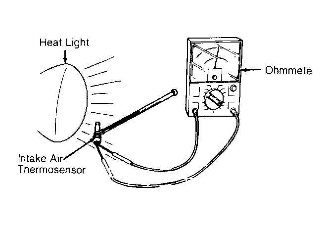 Remove intake air thermosensor. See Figure , Figure & Fig 1 . Using a heat lamp, ohmmeter and thermometer, measure resistance of sensor at various temperatures. See INTAKE AIR TEMPERATURE SENSOR RESISTANCE SPECIFICATIONS  table. Replace sensor if not within specification.