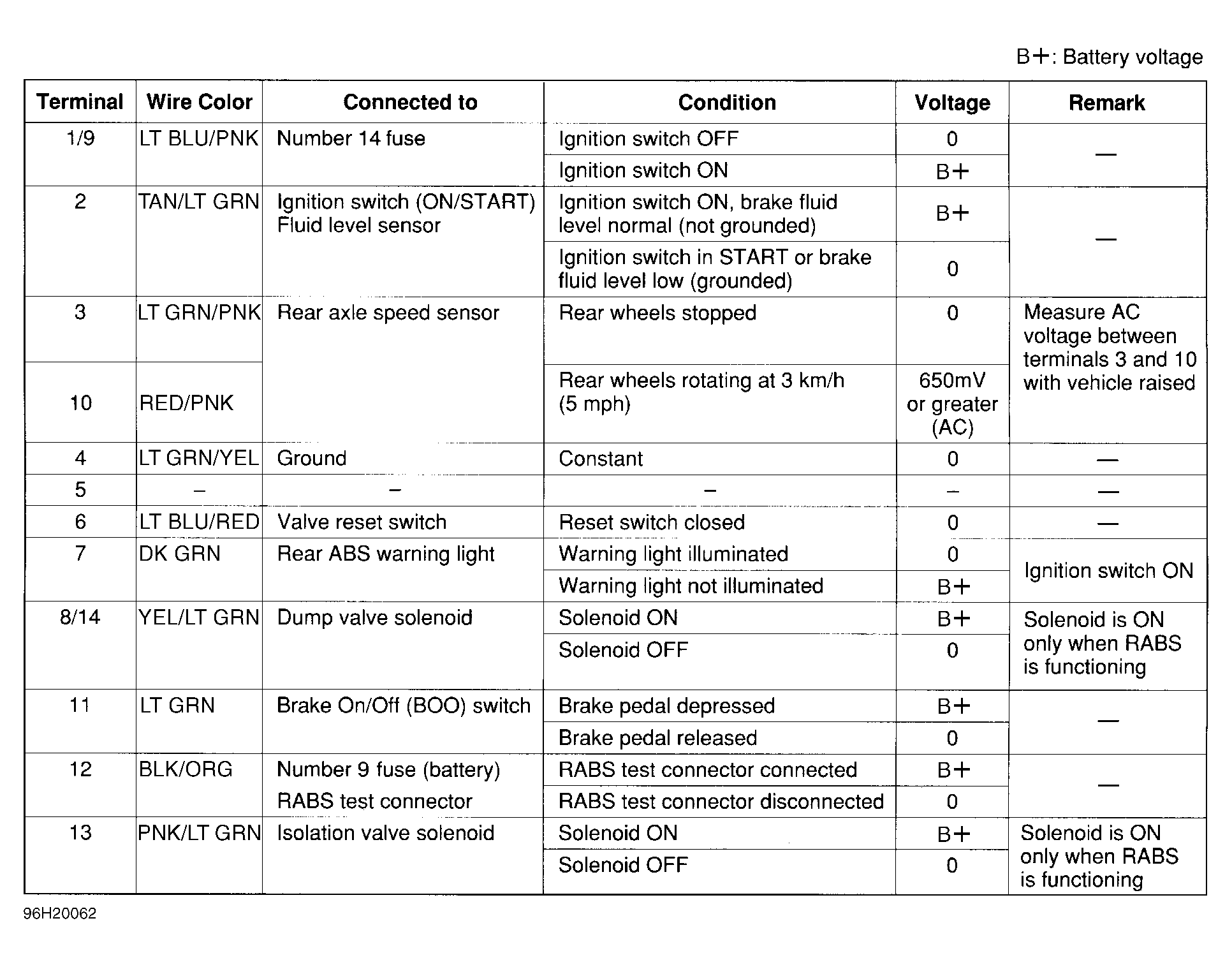 Disconnect negative battery cable. Disconnect RABS control module harness connector. See COMPONENT LOCATIONS . Using DVOM, measure voltage between applicable terminal of RABS control module harness connector and ground. See Fig 1 . If voltage is not as specified, replace RABS control module.