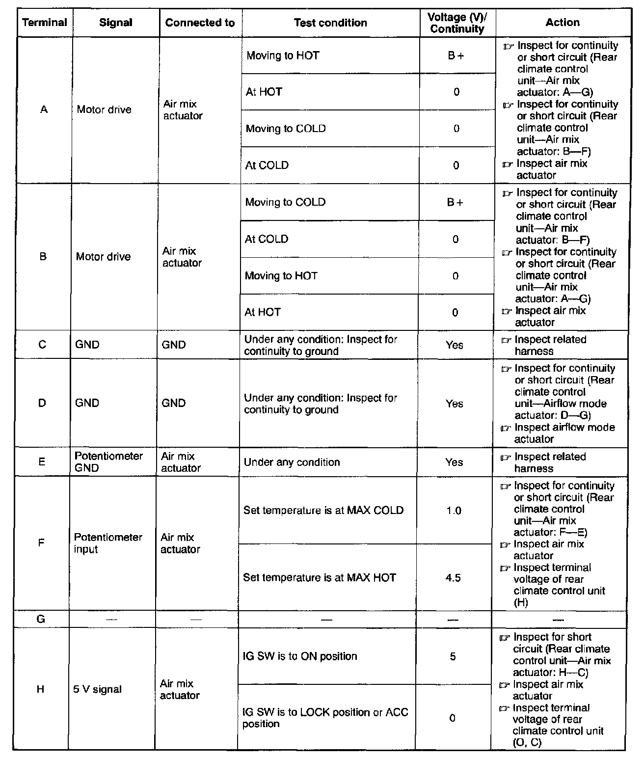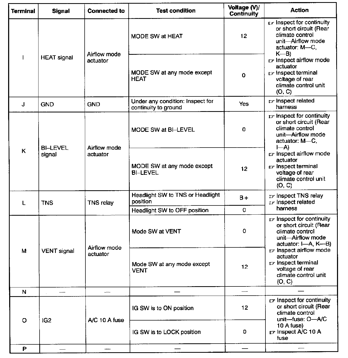 3. Measure the voltage at each rear climate control unit terminal and refer to terminal voltage list.
