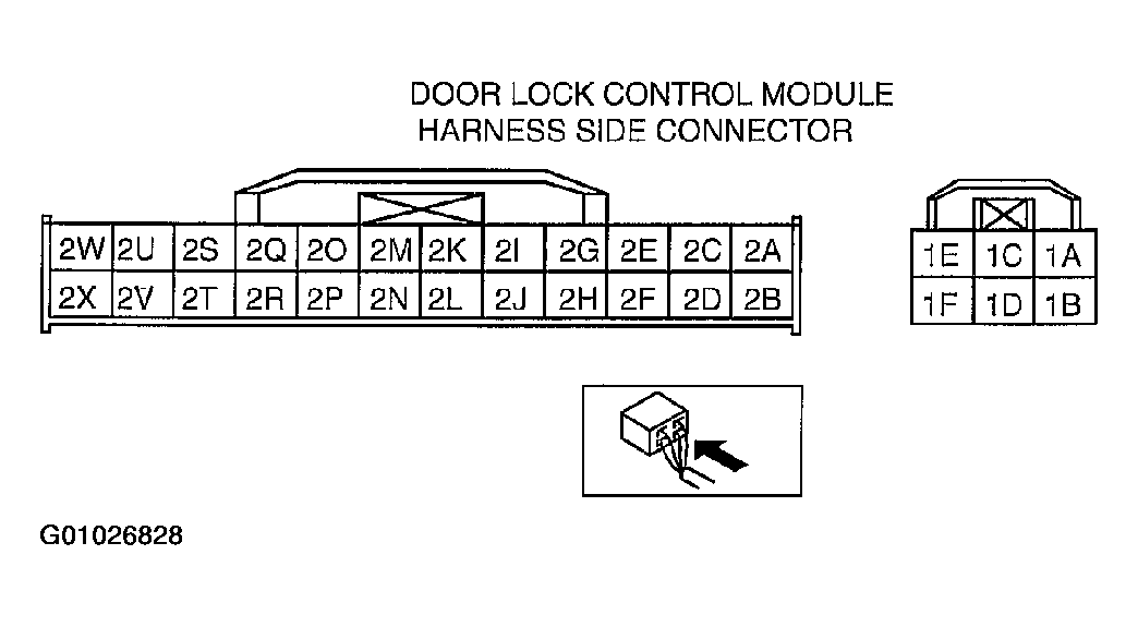 3. Disconnect the door lock control module connector and inspect for continuity between terminal 1E or 2W and the bracket.