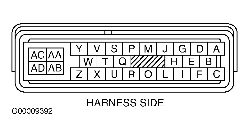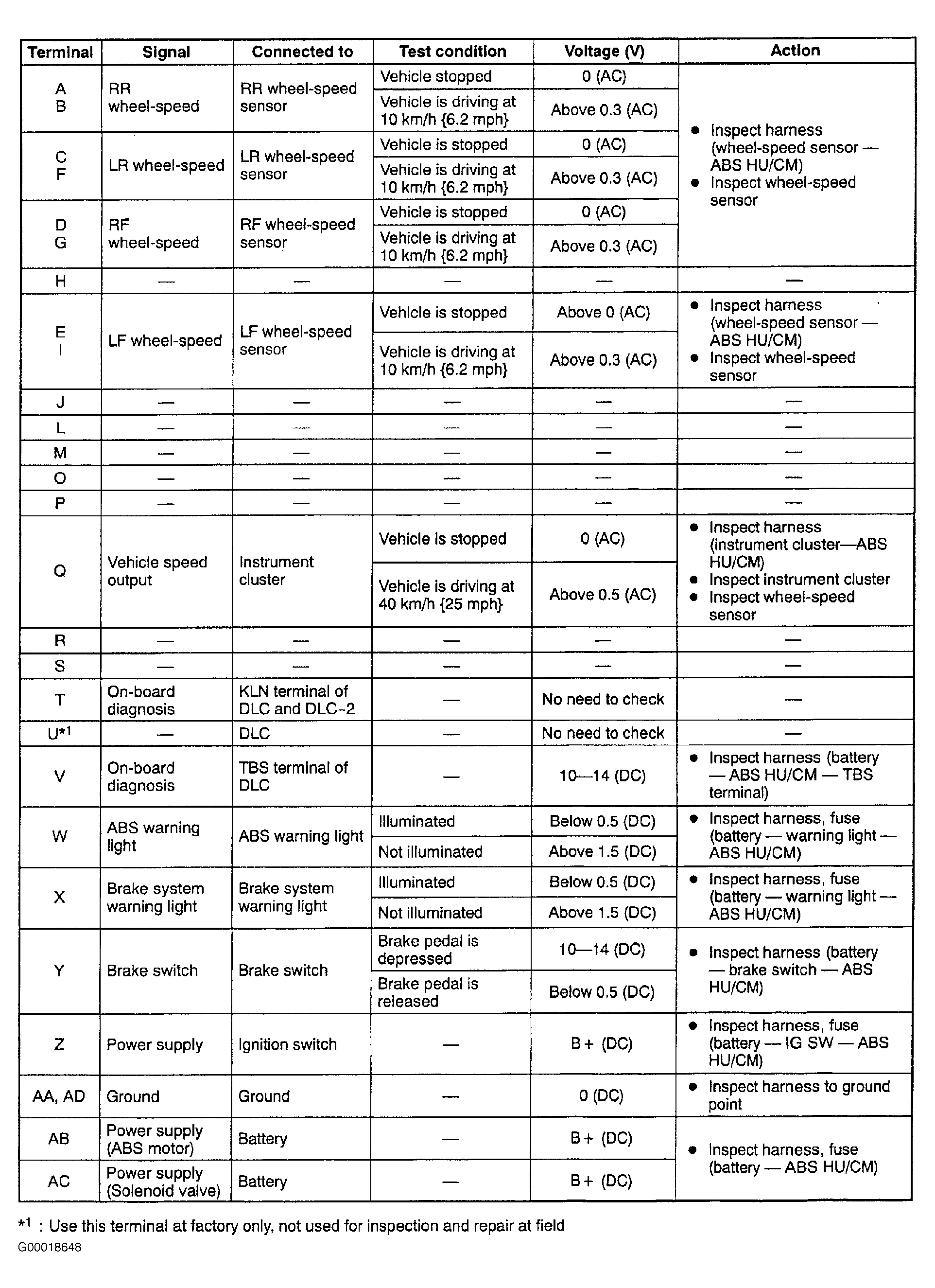 Turn ignition switch to OFF position. Test ABS CM using DVOM and Adapter Harness (49-L066-001 ) connected to ABS CM connector. Measure voltage between applicable terminal and terminal "A" (ground) of ABS CM connector. See Figure . If voltage, continuity or resistance is not as specified, replace ABS CM. See Fig 1 .