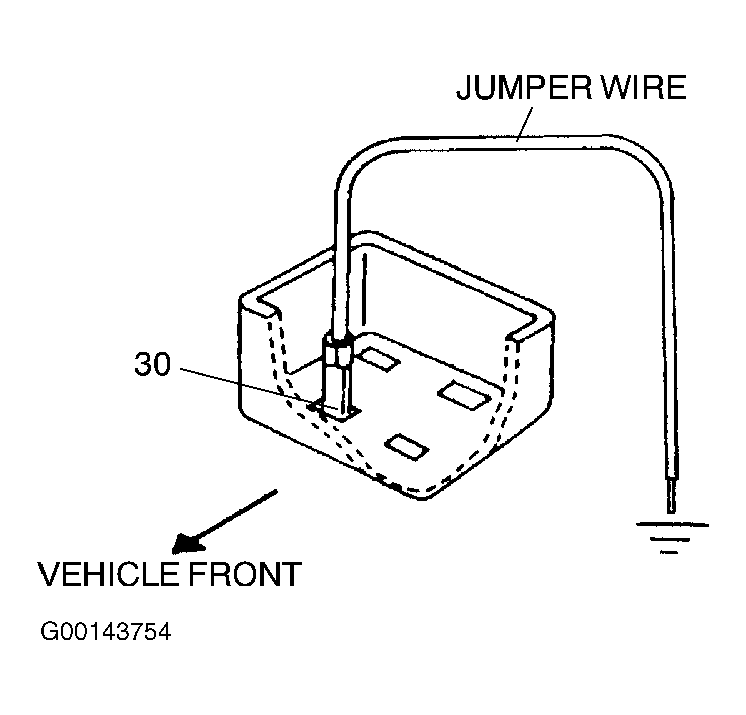Disconnect negative battery cable. Remove fuel pump relay from underhood main relay box. Connect fused jumper wire between ground and fuel pump relay socket terminal No. 30. See Fig 1. Reconnect negative battery cable for about 5 minutes. Inspect for leakage at fuel hoses, clamps and pipe sealing surfaces. If leaks are found, turn ignition switch off. Release fuel system pressure. See FUEL SYSTEM PRESSURE RELEASE . Repair or replace components as necessary and retest fuel system. If no leaks are found, disconnect negative battery cable and then fused jumper wire.
