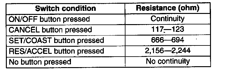 - It not as specified, replace the cruise control switch. (See AUDIO CONTROL SWITCH REMOVAL/INSTALLATION.)