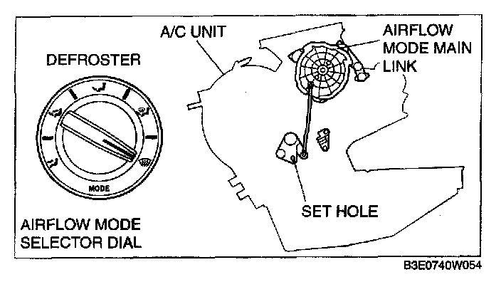 2. Set the airflow mode main link to the defroster position and insert an approx. Dia 5 Phillips screwdriver into the set hole to fix the position of the link.