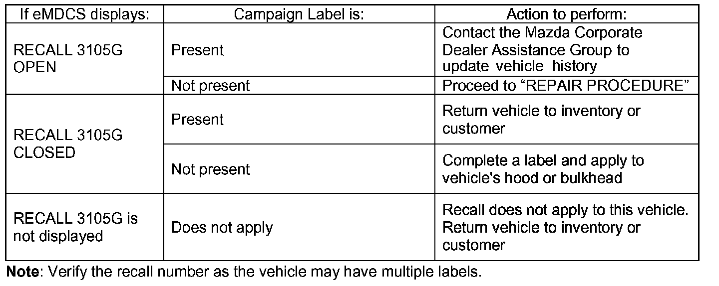 2. Perform a Warranty Vehicle Inquiry using your eMDCS System and inspect vehicle for Campaign Label RECALL 31050 attached to the vehicle's hood or bulkhead.