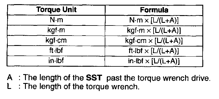 Torque Formulas- When using a torque wrench-SST or equivalent combination, the written torque must be recalculated due to the extra length that the SST or equivalent adds to the torque wrench. Recalculate the torque by using the following formulas. Choose the formula that applies to you.