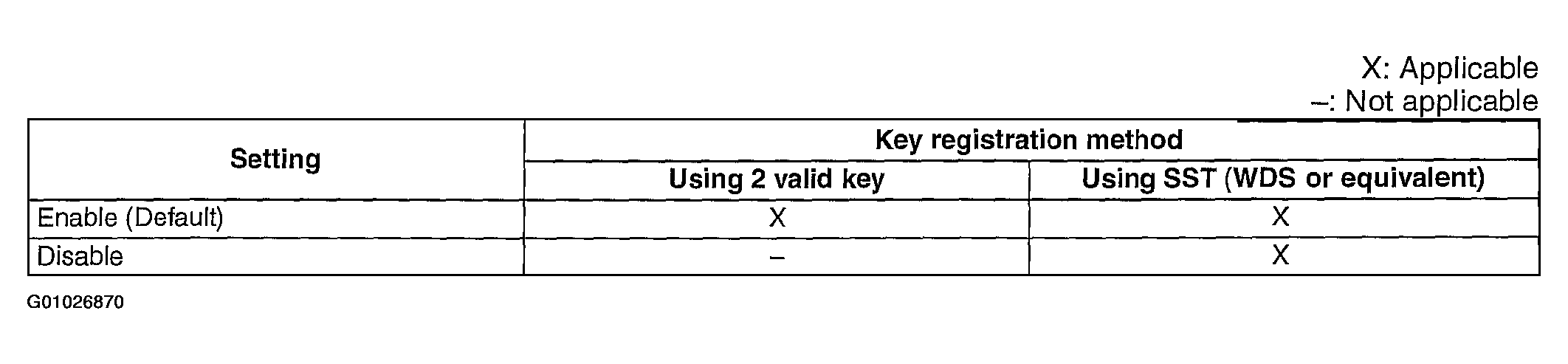 • With this function, enabling and disabling of the "When the customer has two or more valid keys" function can be set using the SST  (WDS or equivalent). This function is provided to prohibit drivers from performing the reprogram procedure on vehicles owned by rental car companies or other large vehicle fleet owners.