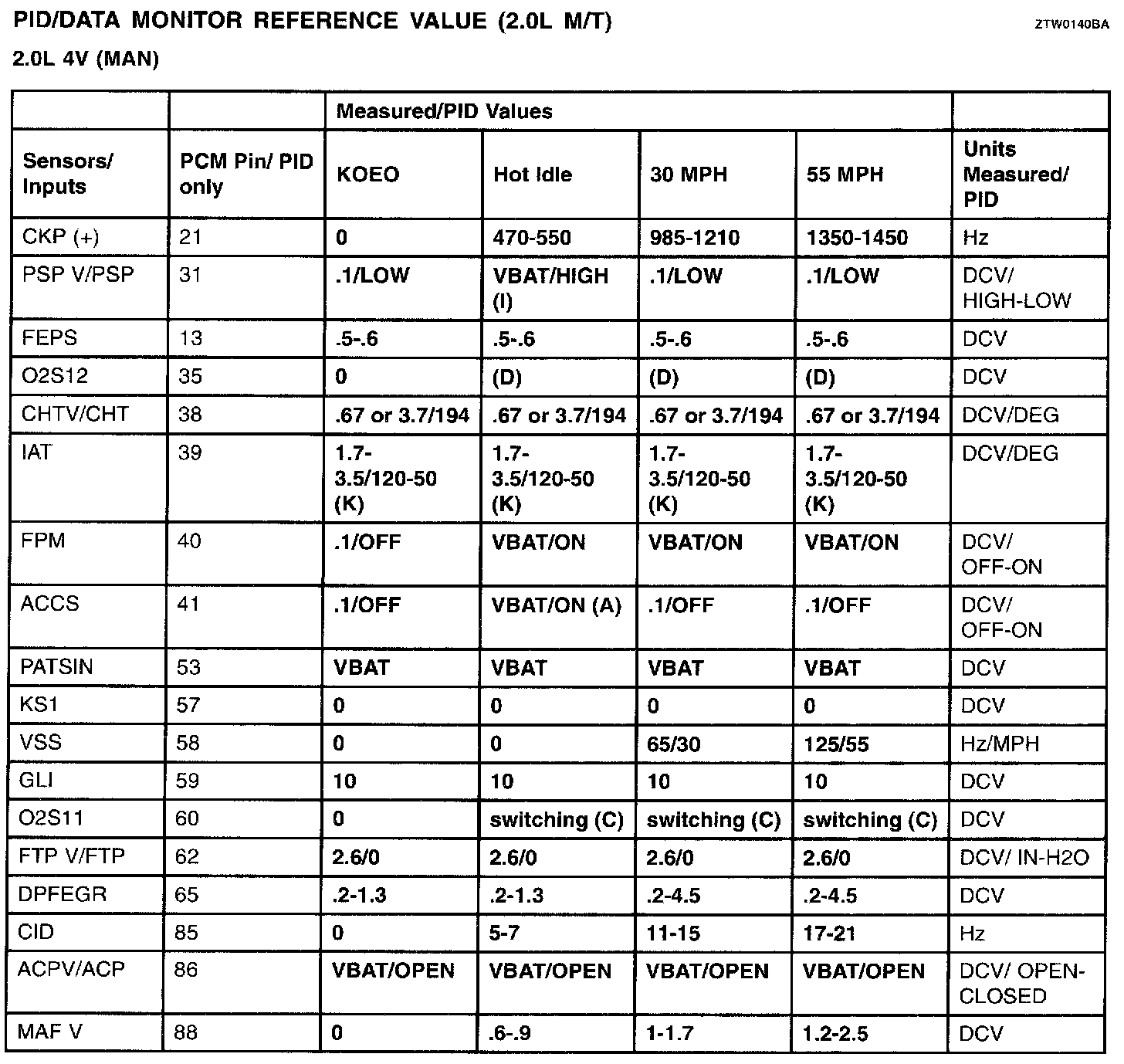 PID/Data Monitor Reference Value (2.0L M/T) Part 1: