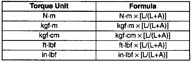 Torque Formulas- When using a torque wrench-SST or equivalent combination, the written torque must be recalculated due to the extra length that the SST or equivalent adds to the torque wrench. Recalculate the torque by using the following formulas. Choose the formula that applies to you.