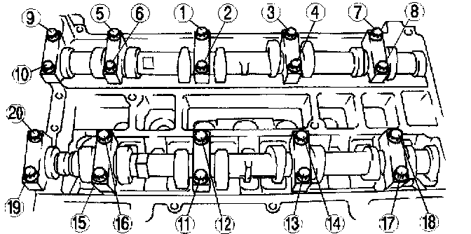 Loosen the camshaft cap bolts in two or three steps in the order shown in the figure