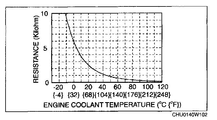 3. Place the detection part of the ECT sensor in water and verify that the resistance between ECT sensor terminals A and B is as indicated in the table while gradually increasing water temperature.
