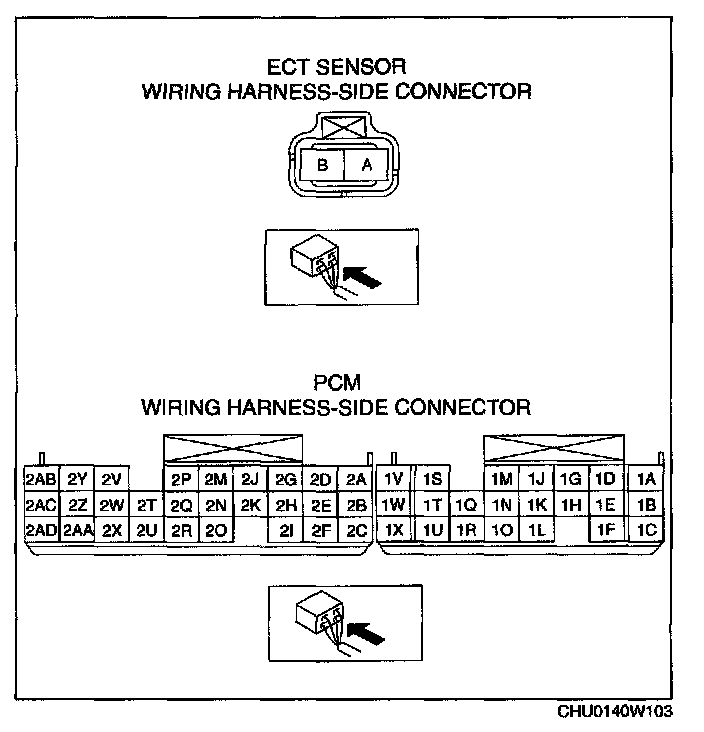 - ECT sensor terminal B and PCM terminal 1U