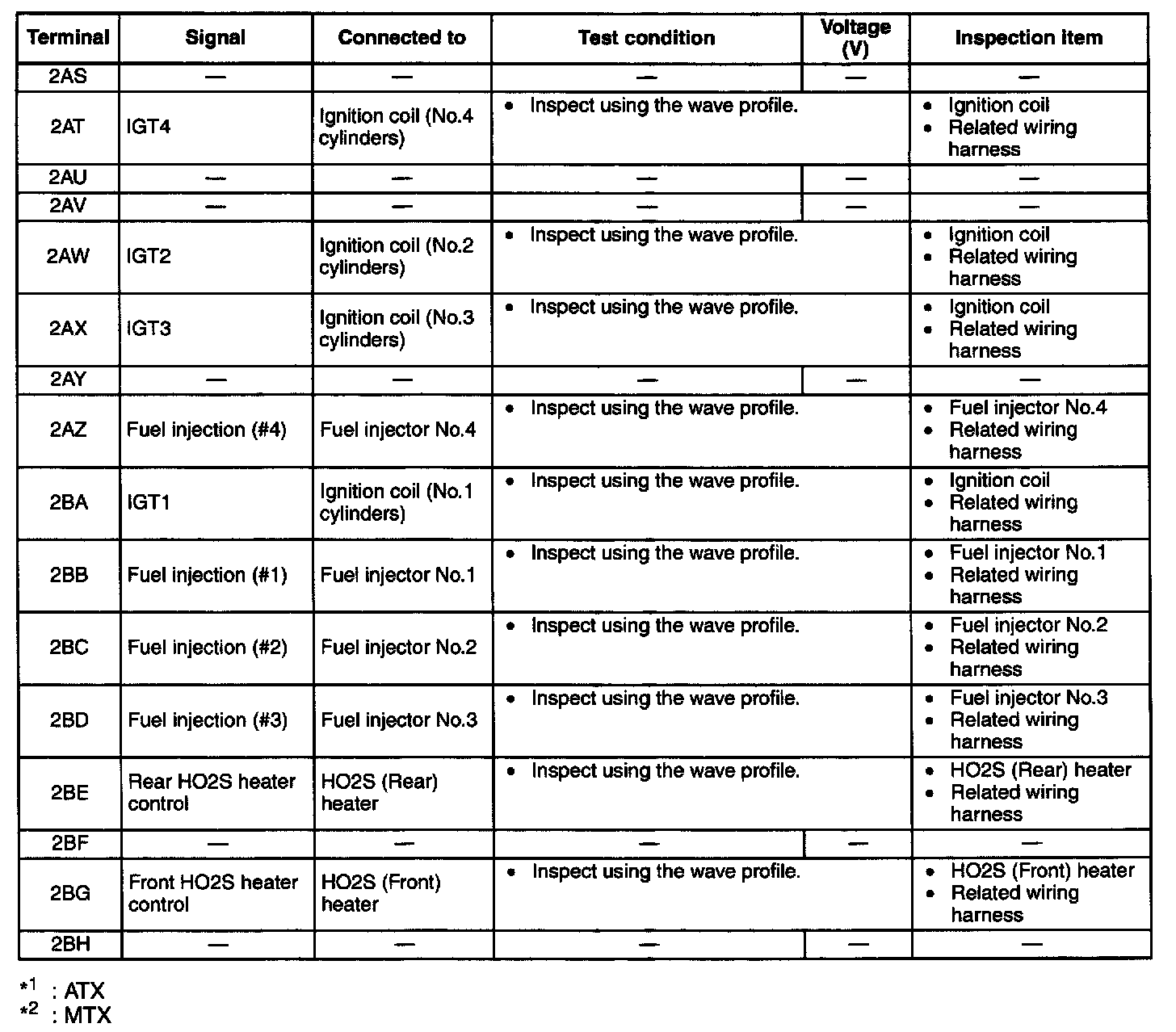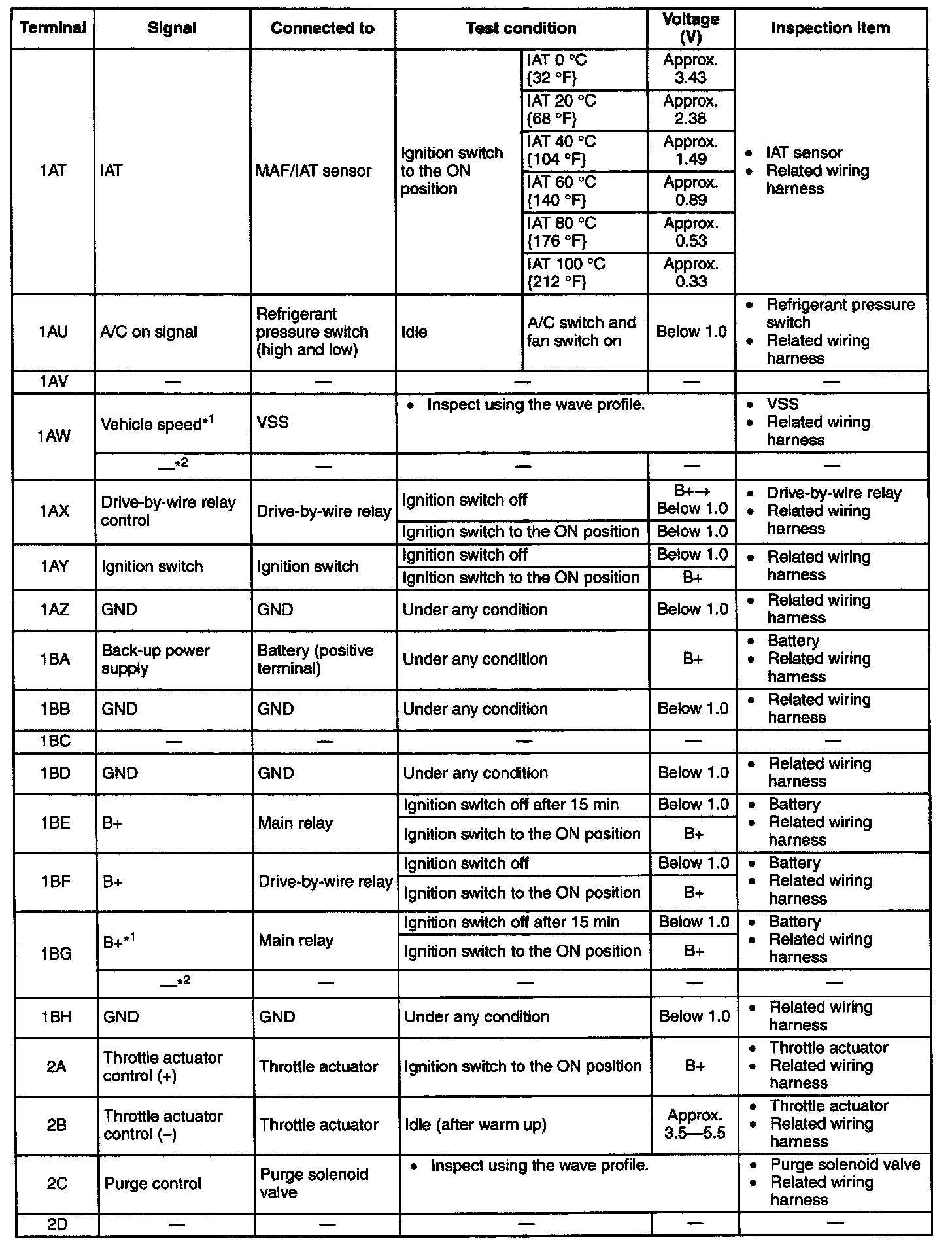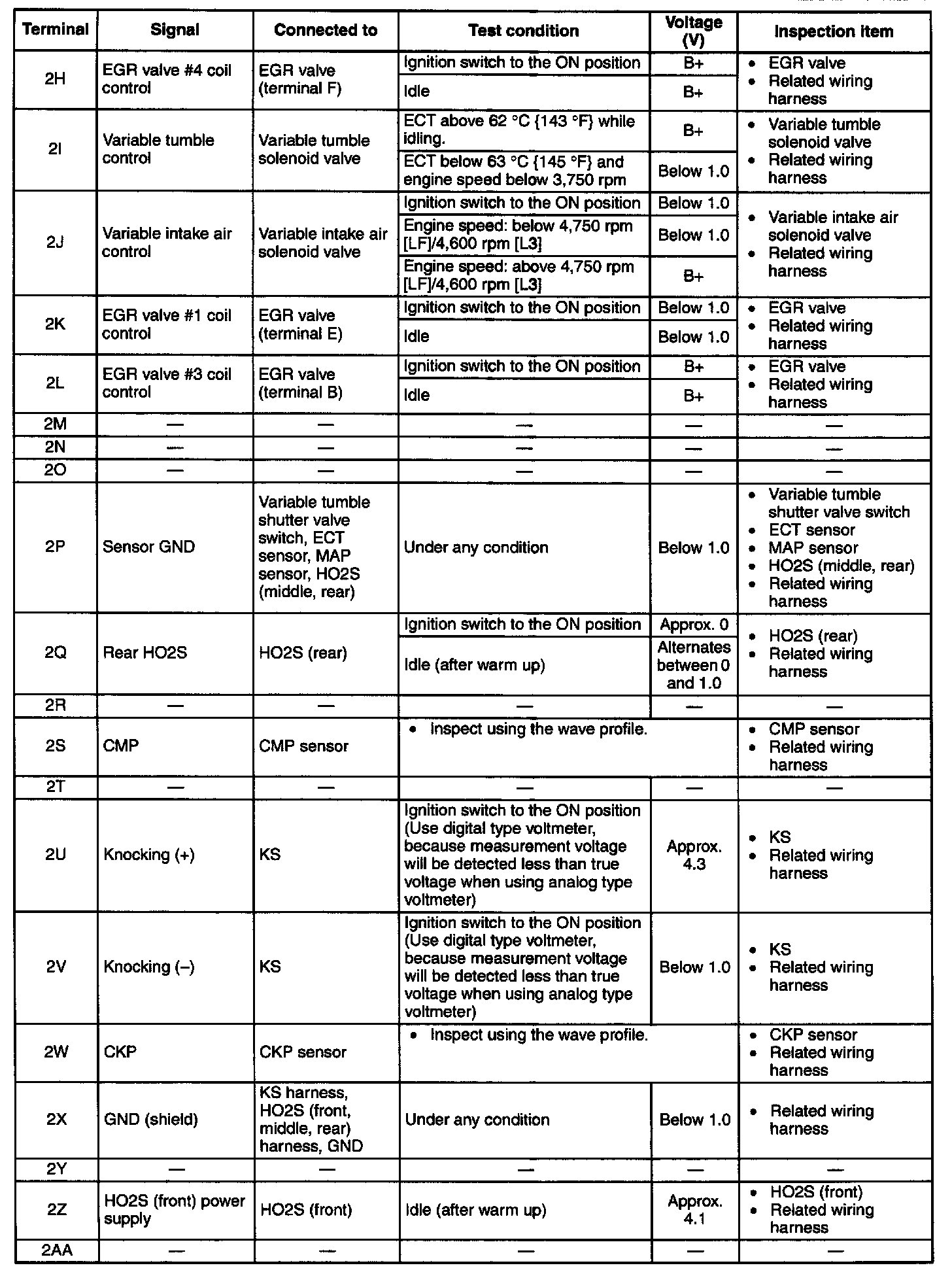 NOTE: The PCM terminal voltage can vary with the conditions when measuring and changes due to aged deterioration on the vehicle, causing false diagnosis. Therefore determine comprehensively where the malfunction occurs among the input systems, output systems, and the PCM.