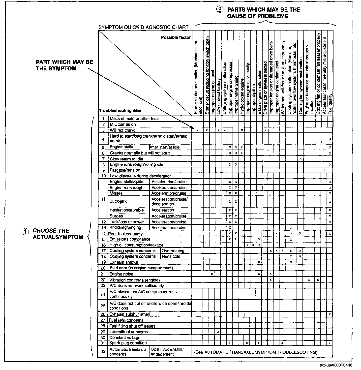 - The chart is effective in quickly narrowing down the relation between symptom and cause of the malfunction. It also specifies the area of the common cause when multiple malfunction symptoms occur.