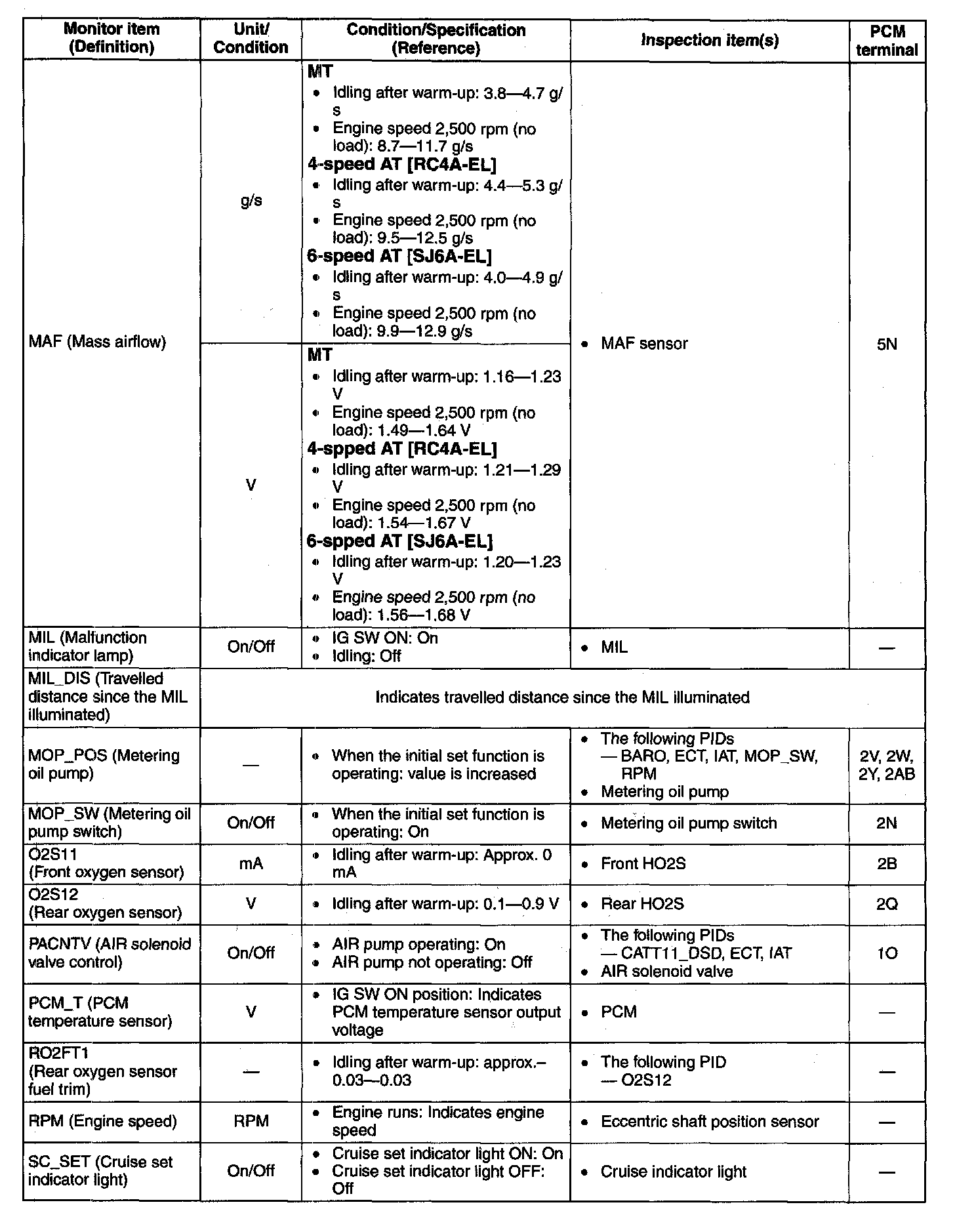 PID/DATA Monitor Table (Reference)