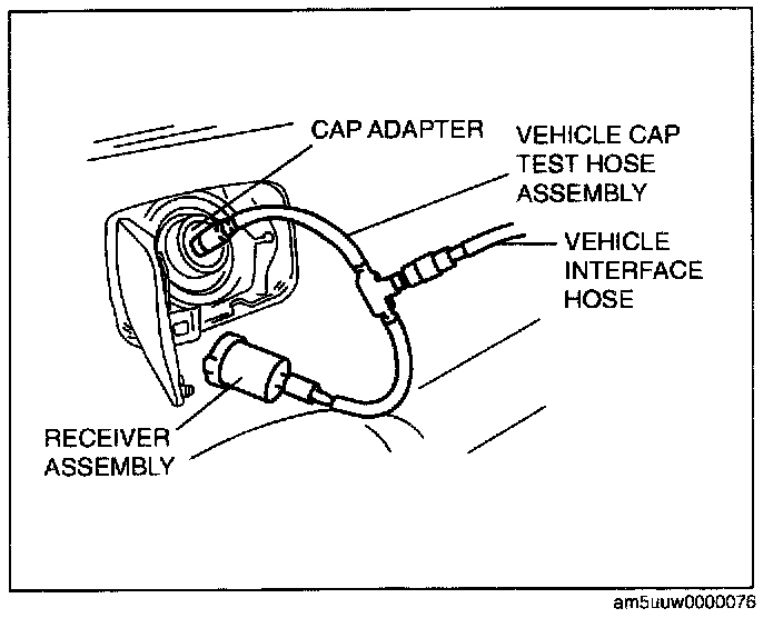 3 Connect the receiver assembly (SST:AKS441 130) to the vehicle cap test hose assembly (part of the SST) and the fuel-filler cap from the vehicle.