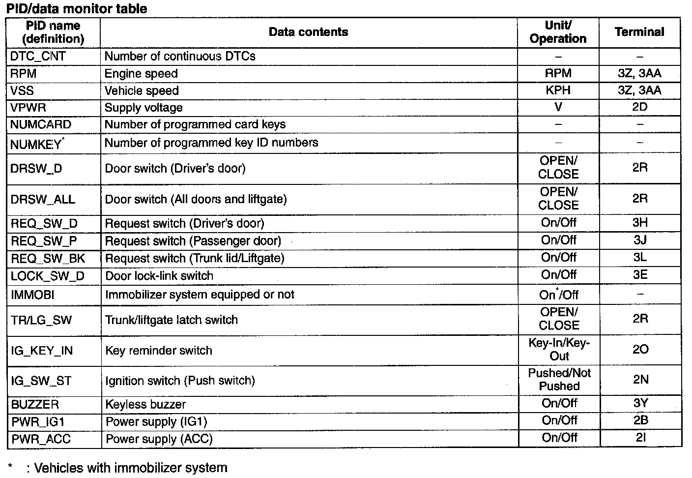 PID/Data Monitor Table (Advanced Keyless System)