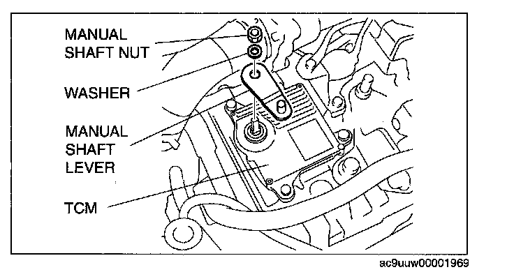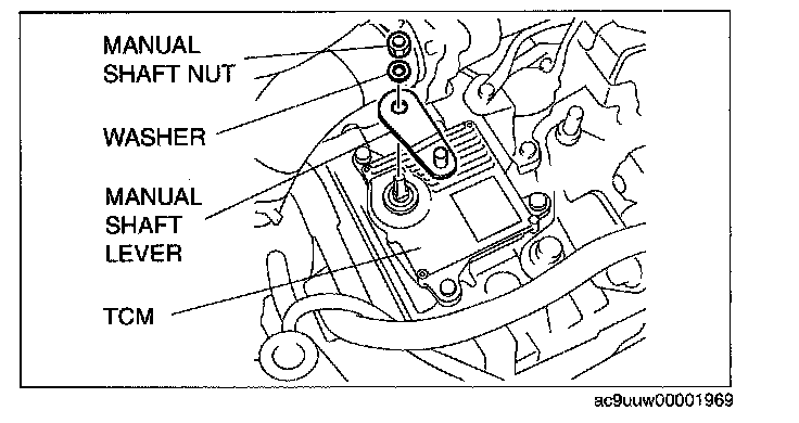 ^ Do not use an impact wrench. Hold the manual shaft lever when removing the manual shaft nut, or the transaxle may be damaged.