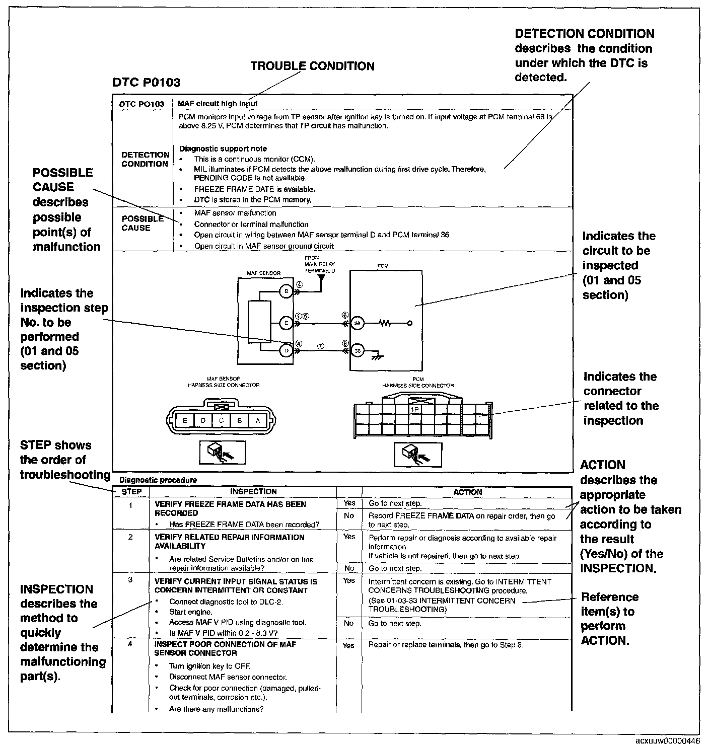 - DTC troubleshooting flow shows diagnostic procedures, inspection methods, and proper action to take for each DTC.