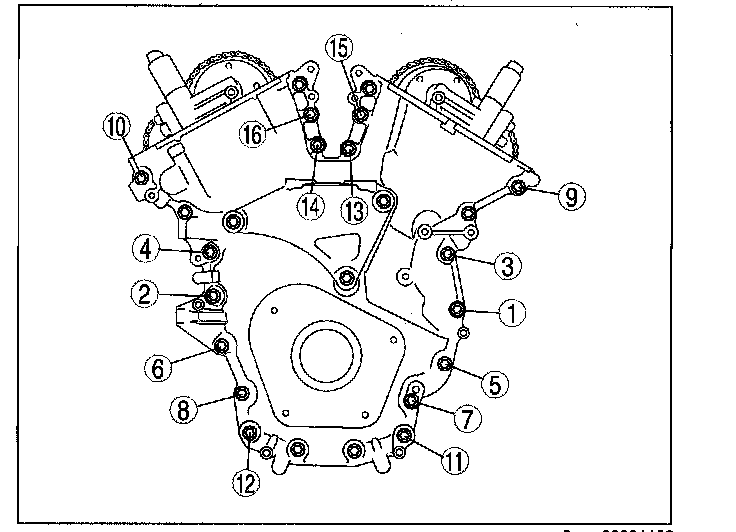 Tighten the engine front cover installation bolts in the order in 2 steps in the order shown in the figure.