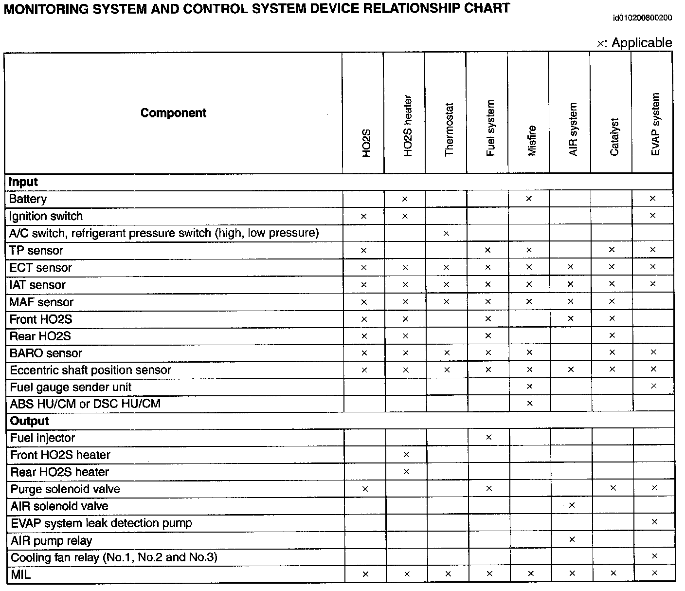Home >> Mazda >> 2007 >> RX8 2RTR-1.3L >> Repair and Diagnosis >> Powertrain Management >> Computers and Control Systems >> Testing and Inspection >> Monitors, Trips, Drive Cycles and Readiness Codes >> Monitoring System and Control System Device Relationship Chart
