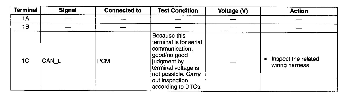 ^ Use the ground of terminal 1P and 1X of the TCM when measuring terminal voltage, as an error may occur when connecting the negative circuit tester to ground.