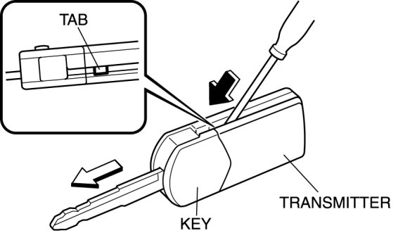 1. Insert a small flathead screwdriver into the transmitter notch and remove the key from the transmitter by pressing the tab.