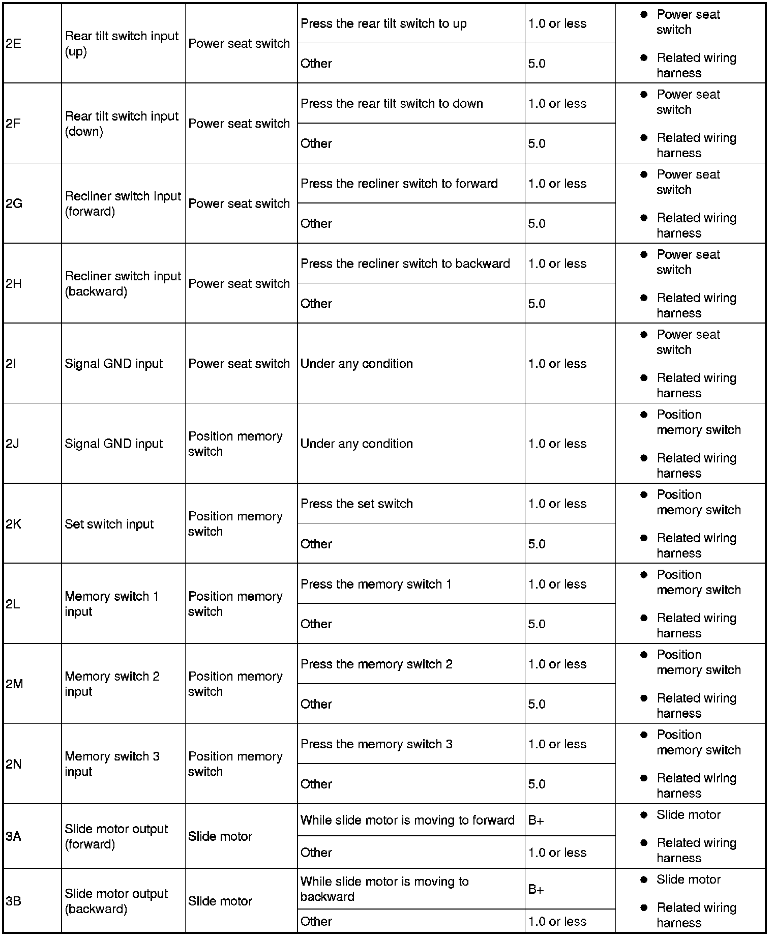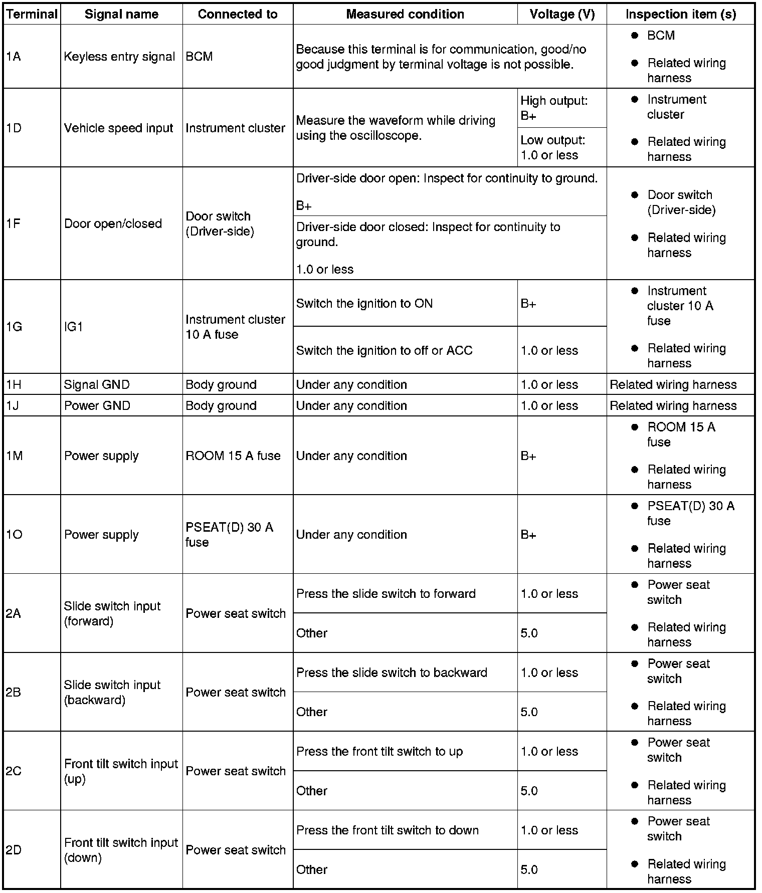 POSITION MEMORY CONTROL MODULE INSPECTIONTerminal Voltage Table (Reference)Terminal Voltage Table (Reference) (Part 1):