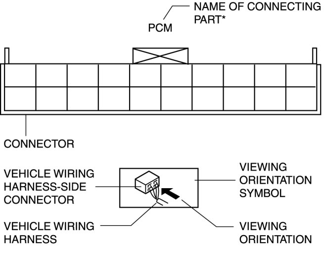 When it is necessary to show the terminal side of vehicle harness-side connectors, such as the following connectors, the viewing direction is from the terminal side.