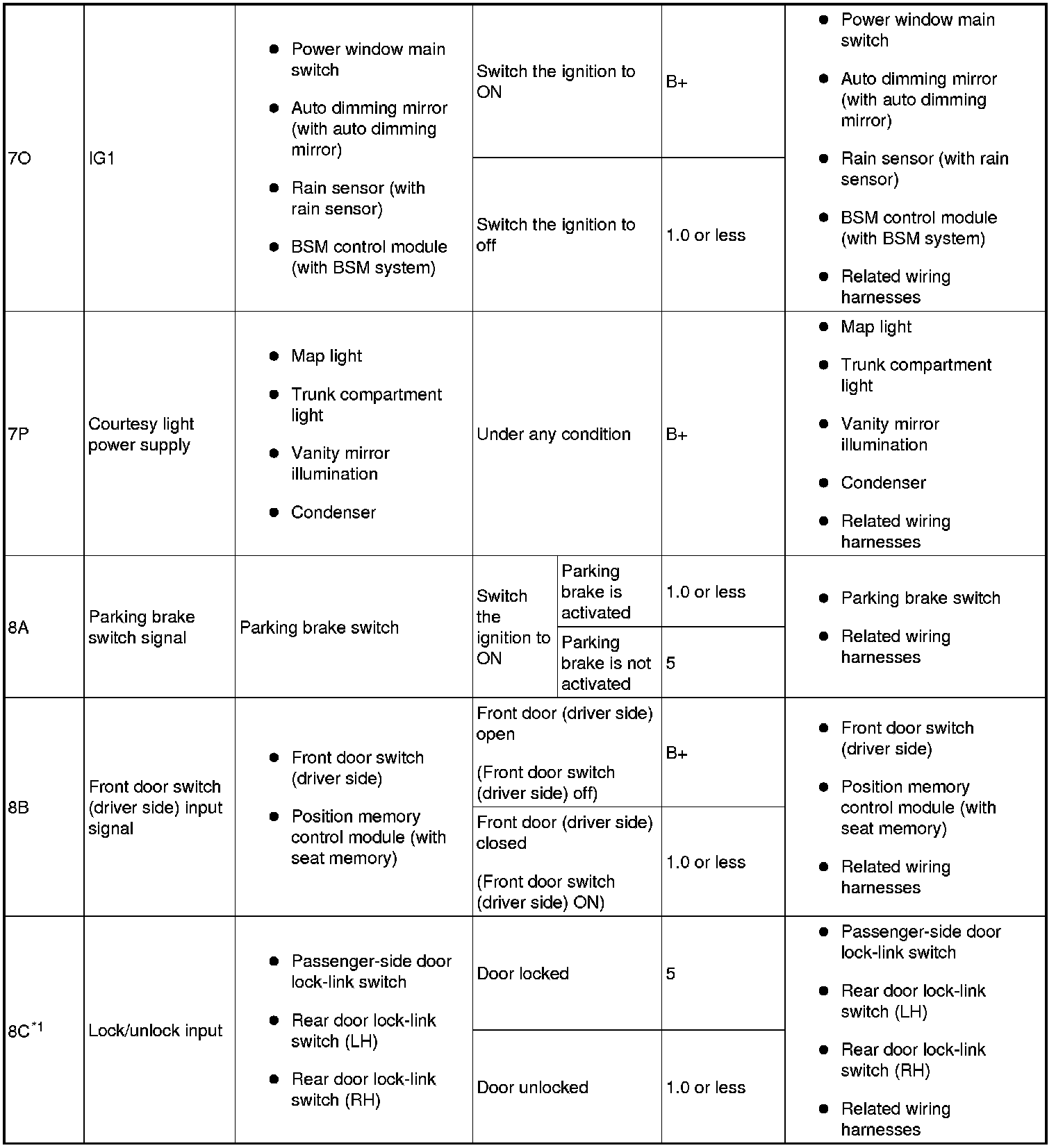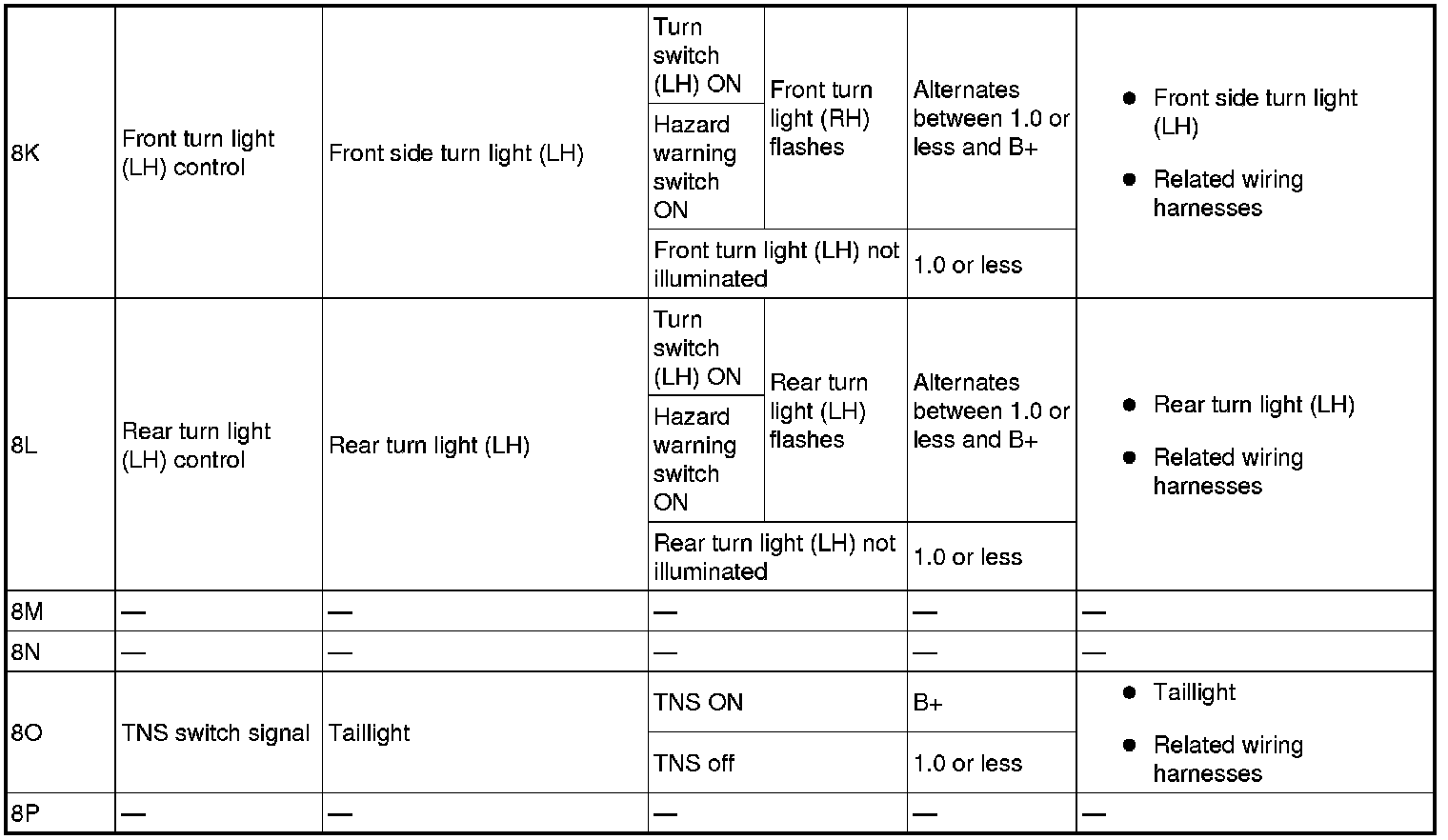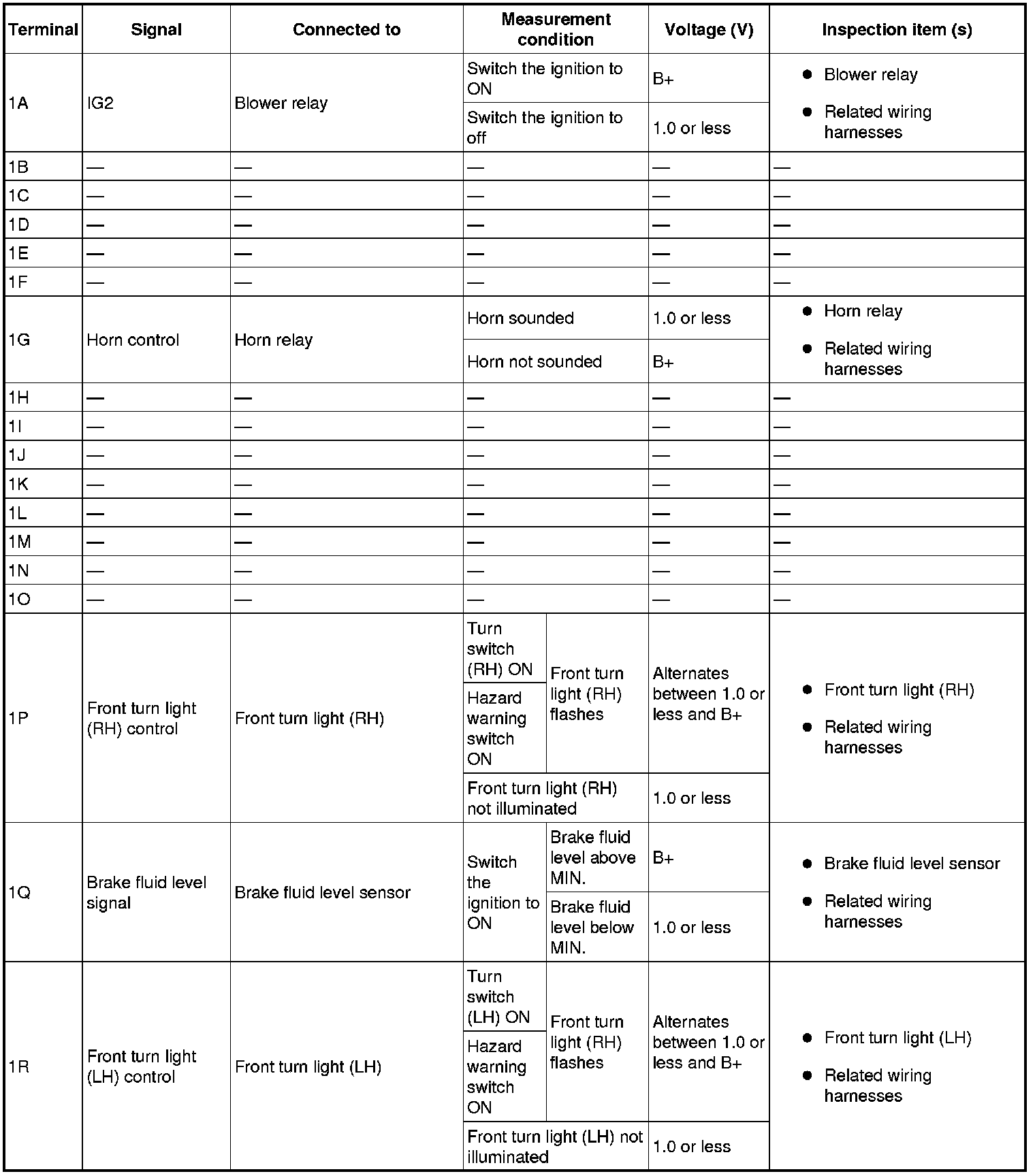 - If the voltage is not as specified in the Terminal Voltage Table, inspect the parts under "Inspection item (s)".