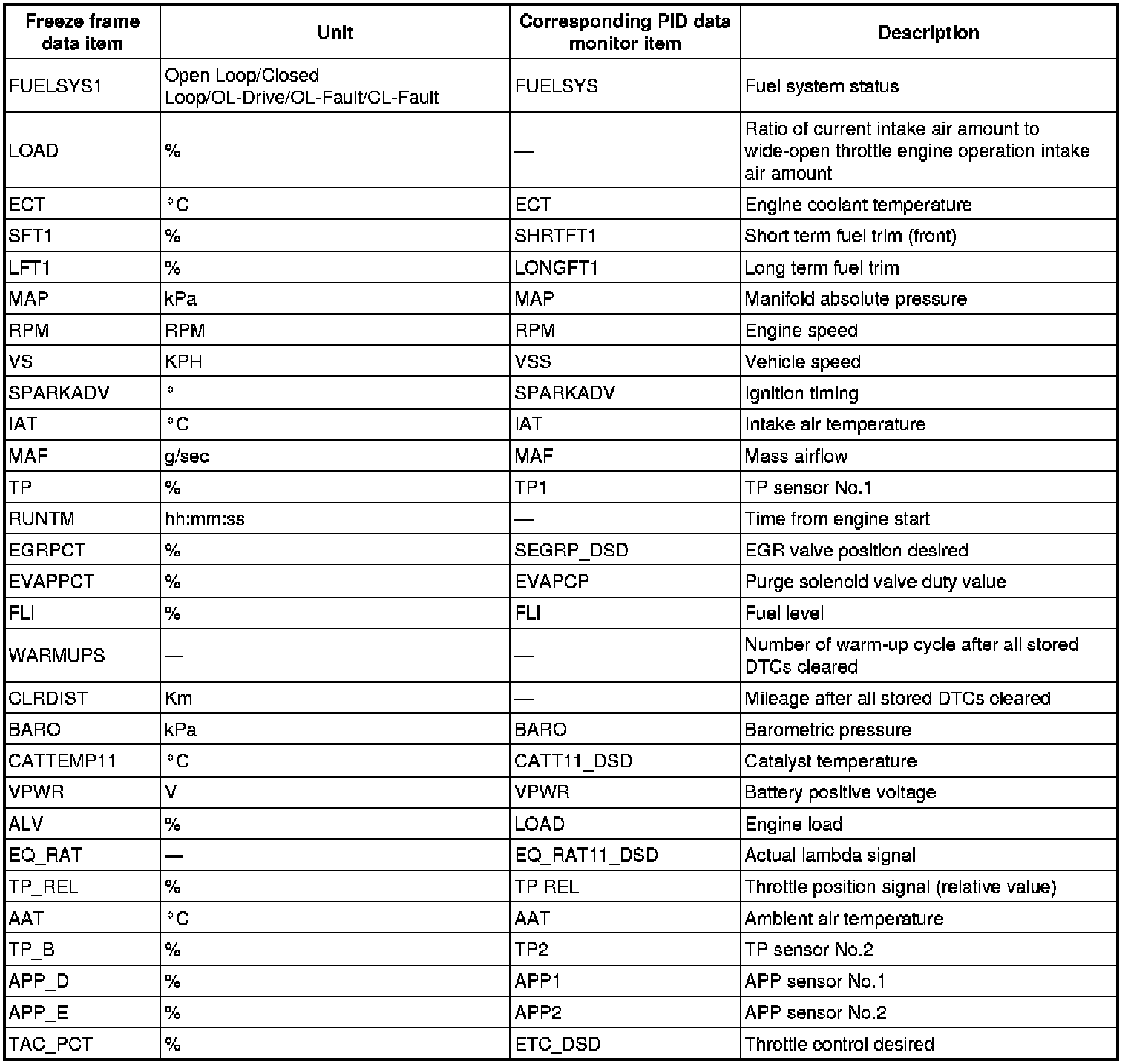- Refer to PID monitor table for confirm the engine control system operation status while the PCM does not store the DTC. (See Component Tests and General Diagnostics)