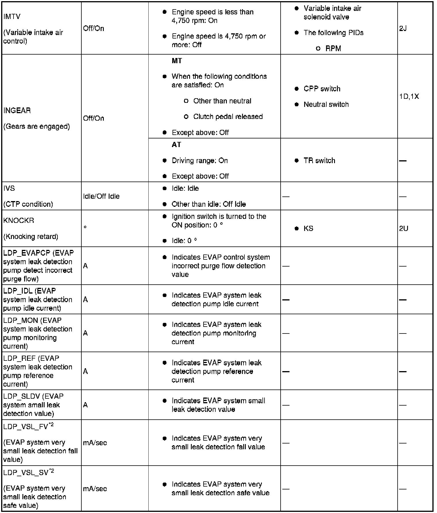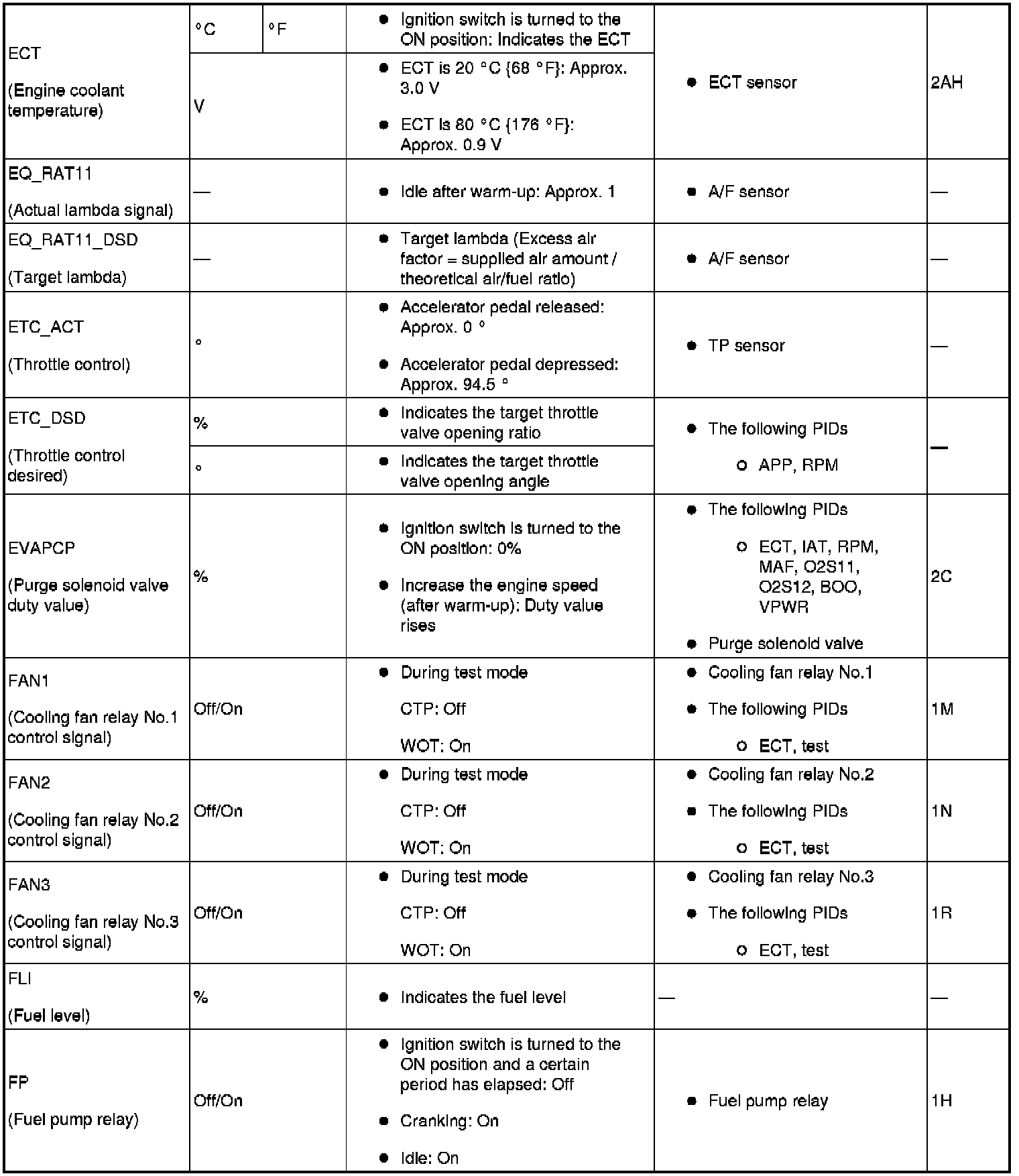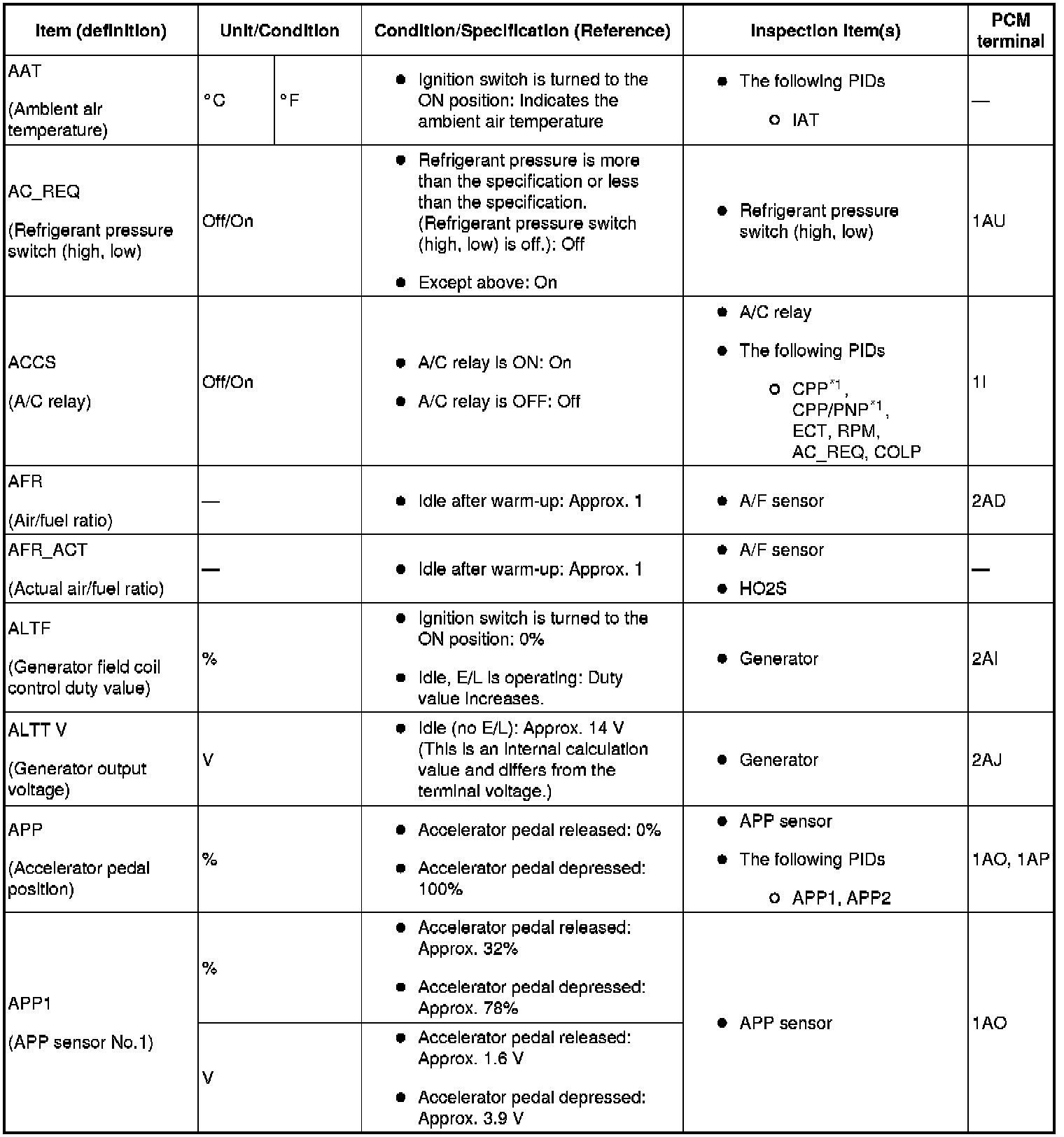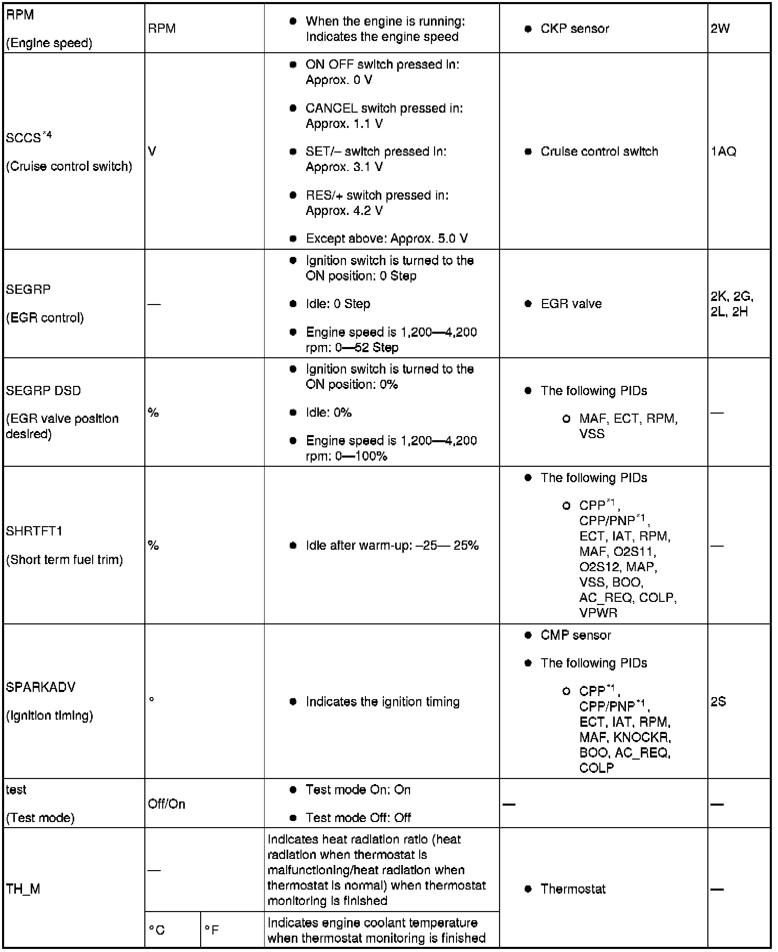 Home >> Mazda >> 2009 >> MX-5 Miata L4-2.0L >> Repair and Diagnosis >> Relays and Modules >> Relays and Modules - Powertrain Management >> Relays and Modules - Computers and Control Systems >> Engine Control Module >> Testing and Inspection >> Pinout Values and Diagnostic Parameters >> PID/Data Monitor Tables
