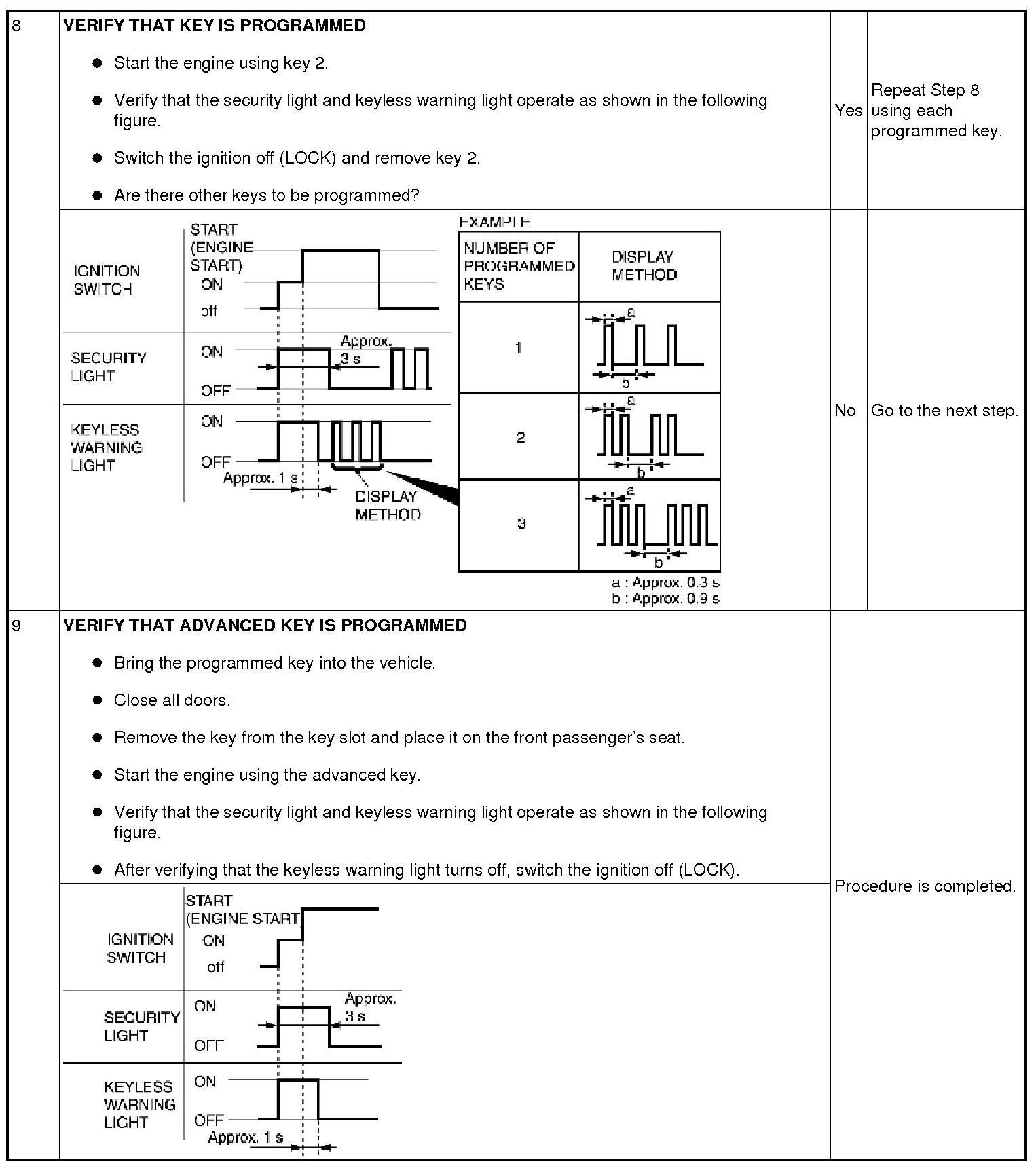 - Although the security light or the keyless warning light illuminates or flashes, this does not indicate an improper procedure. Continue to perform the procedure as indicated.