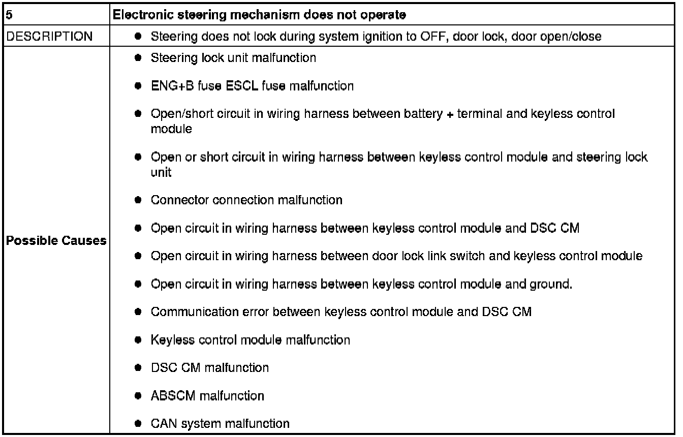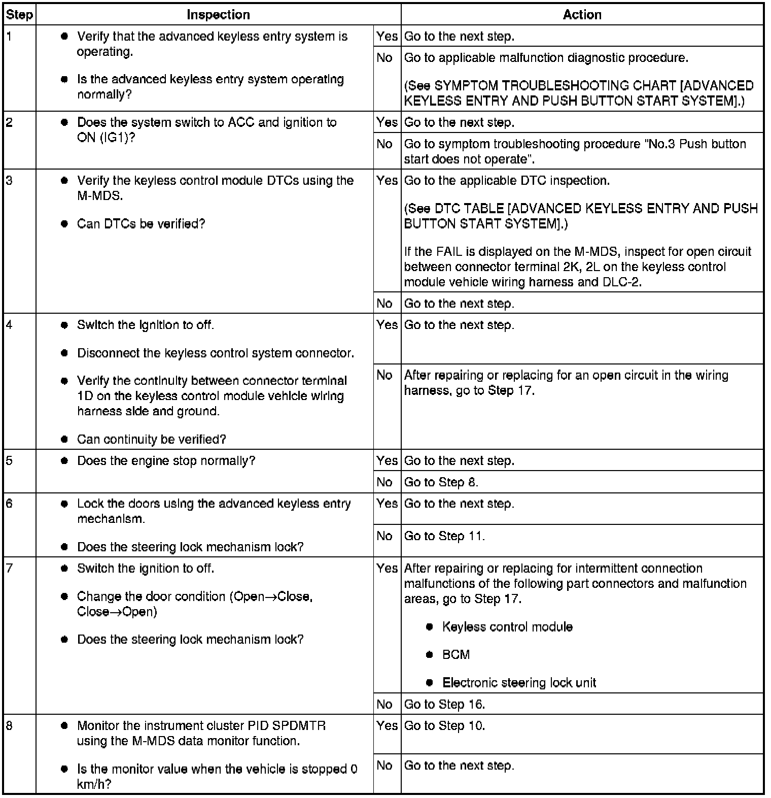 Home >> Mazda >> 2010 >> 3 L4-2.0L >> Repair and Diagnosis >> Body and Frame >> Locks >> Keyless Entry >> Testing and Inspection >> Symptom Related Diagnostic Procedures >> Advanced Keyless Entry And Push Button Start System >> No.5 Electronic Steering Mechanism Does Not Operate - Advanced Keyless Entry And Push Button Start System