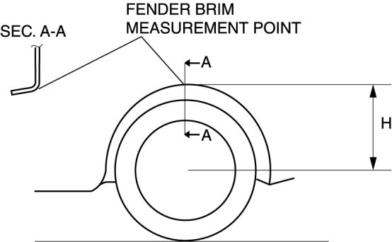 Measure height H from the center of the wheel to the fender brim.Verify that the difference between the left and right dimension H is within the specification. If it exceeds the specification, repeat the Step 2-7.