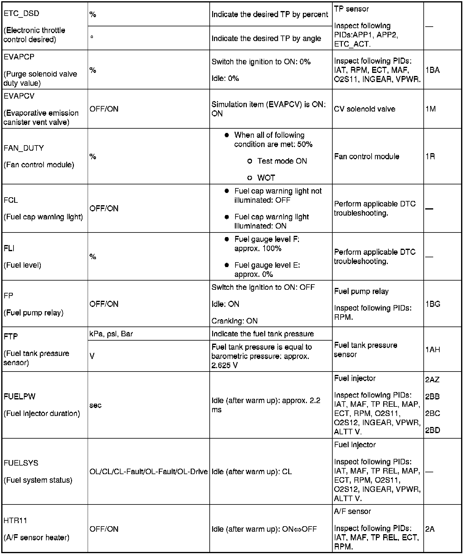 - Refer to PID monitor table for confirm the engine control system operation status while the PCM does not store the DTC. (See Component Tests and General Diagnostics)