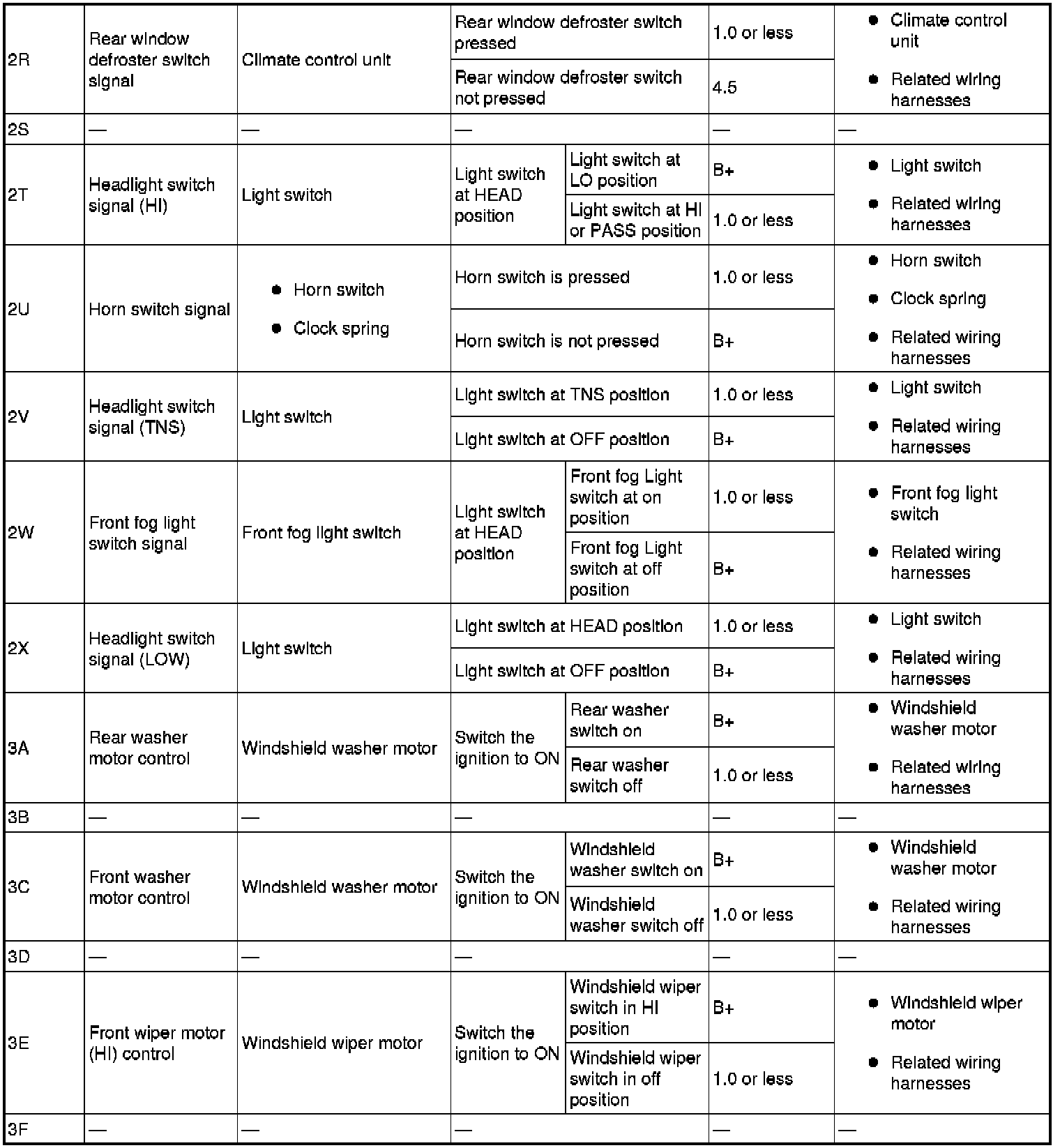 - Rear door switch (LH) signal: 6E (+) and body ground (-)