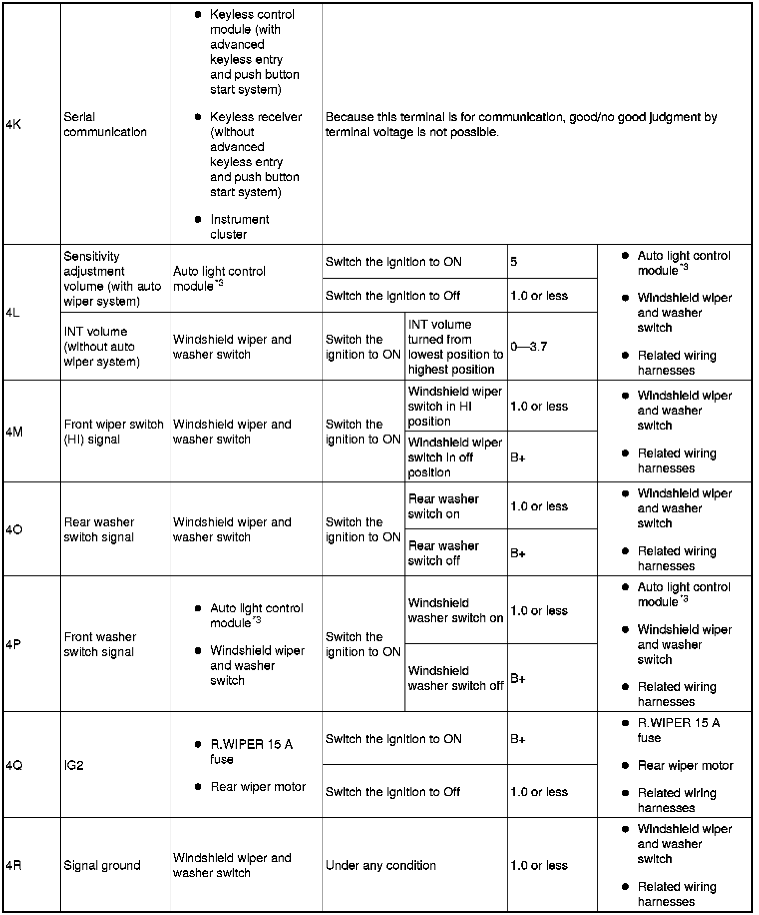 - Rear door switch (RH) signal: 6K (+) and body ground (-)