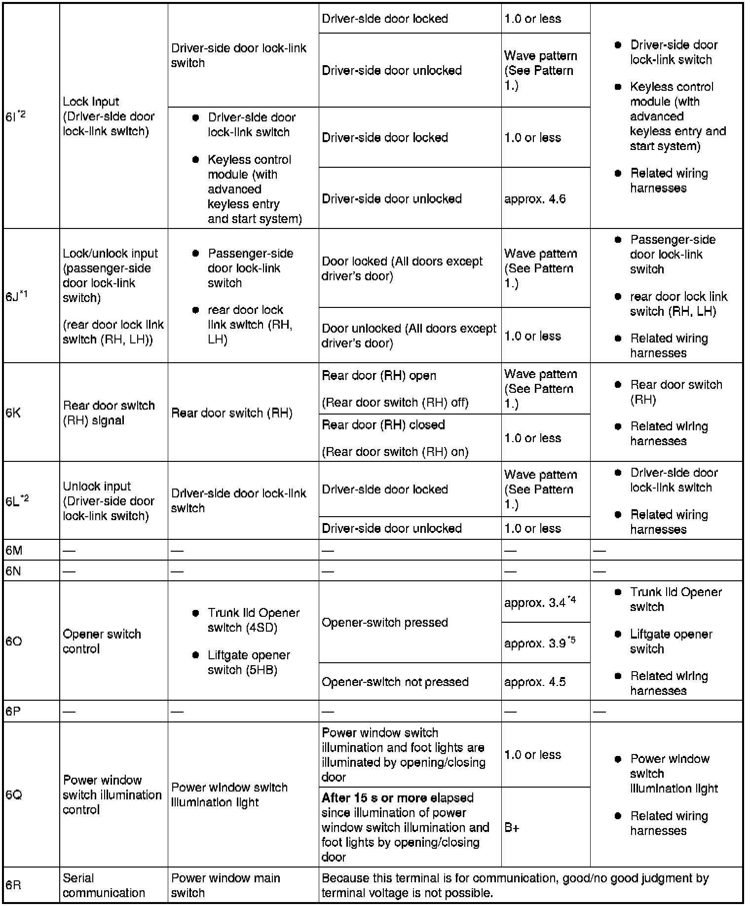 - Lock/unlock input (passenger-side door lock-link switch) (rear door lock link switch (RH, LH)): 6J (+) and body ground (-)