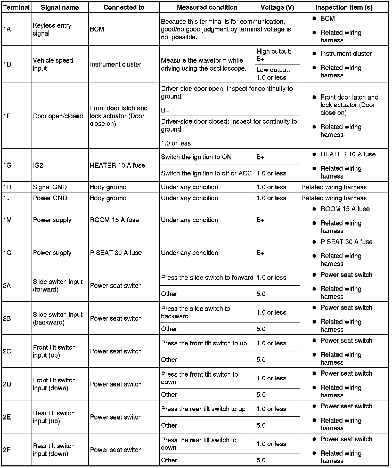 Home >> Mazda >> 2010 >> 3 L4-2.0L >> Repair and Diagnosis >> Relays and Modules >> Relays and Modules - Body and Frame >> Memory Positioning Module >> Testing and Inspection >> Component Tests and General Diagnostics