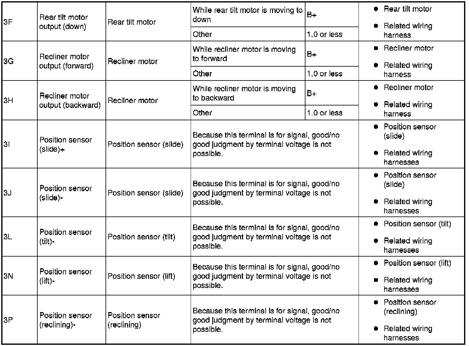 - If the voltage is not as specified in the Terminal Voltage Table (Reference), inspect the parts under "Inspection item (s)" and related wiring harnesses.