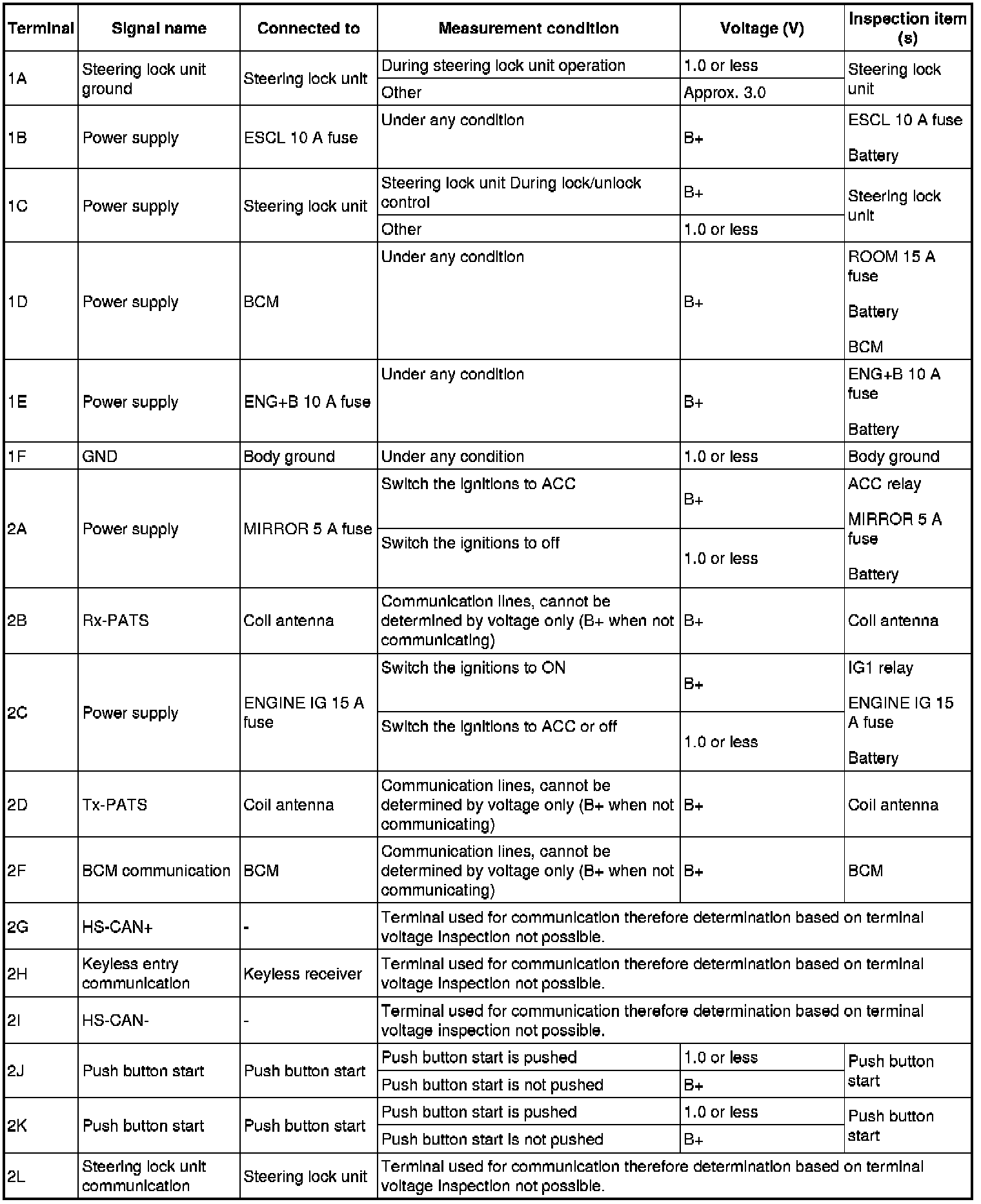 - If the voltages cannot be verified as indicated in the terminal voltage table, inspect the parts under "Inspection item (s)".