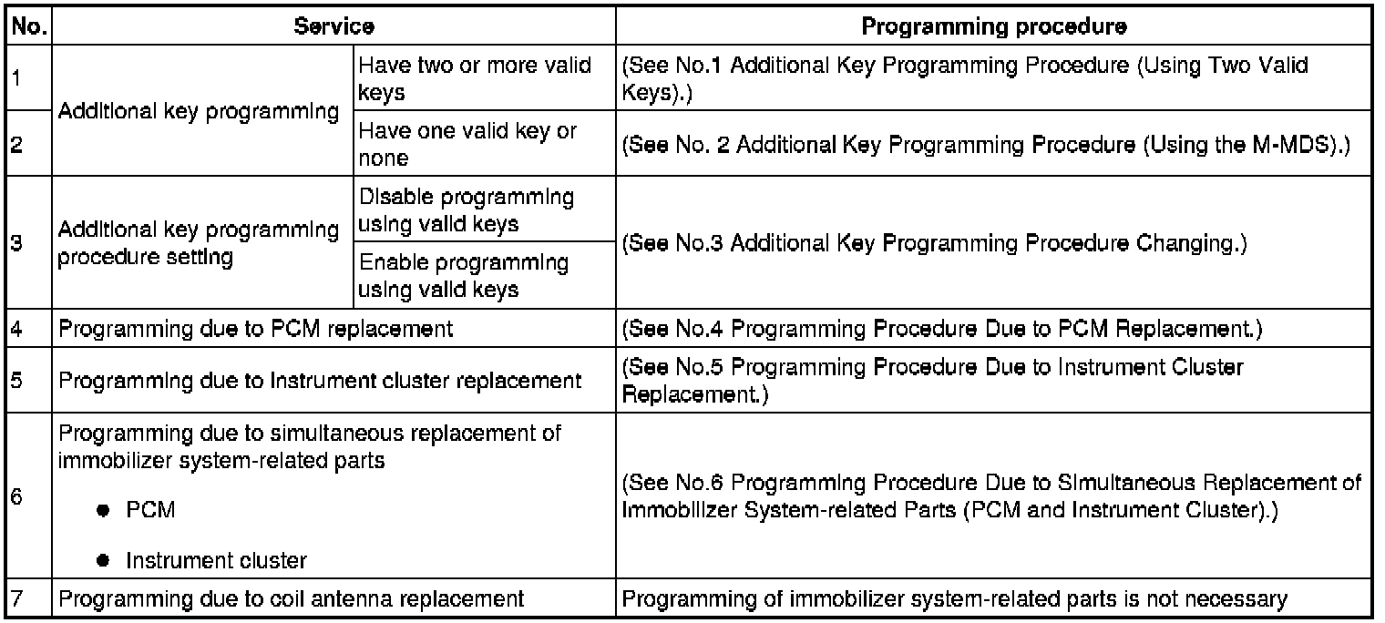 Immobilizer System-Related Parts Service and Programming Procedure Table
