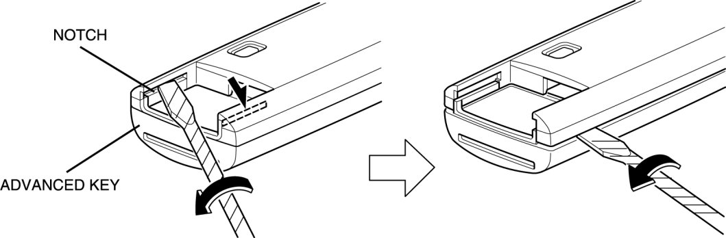 2. Insert a tape-wrapped flathead screwdriver into the notch in the advanced key and rotate it in the direction shown in the figure to open the advanced key.