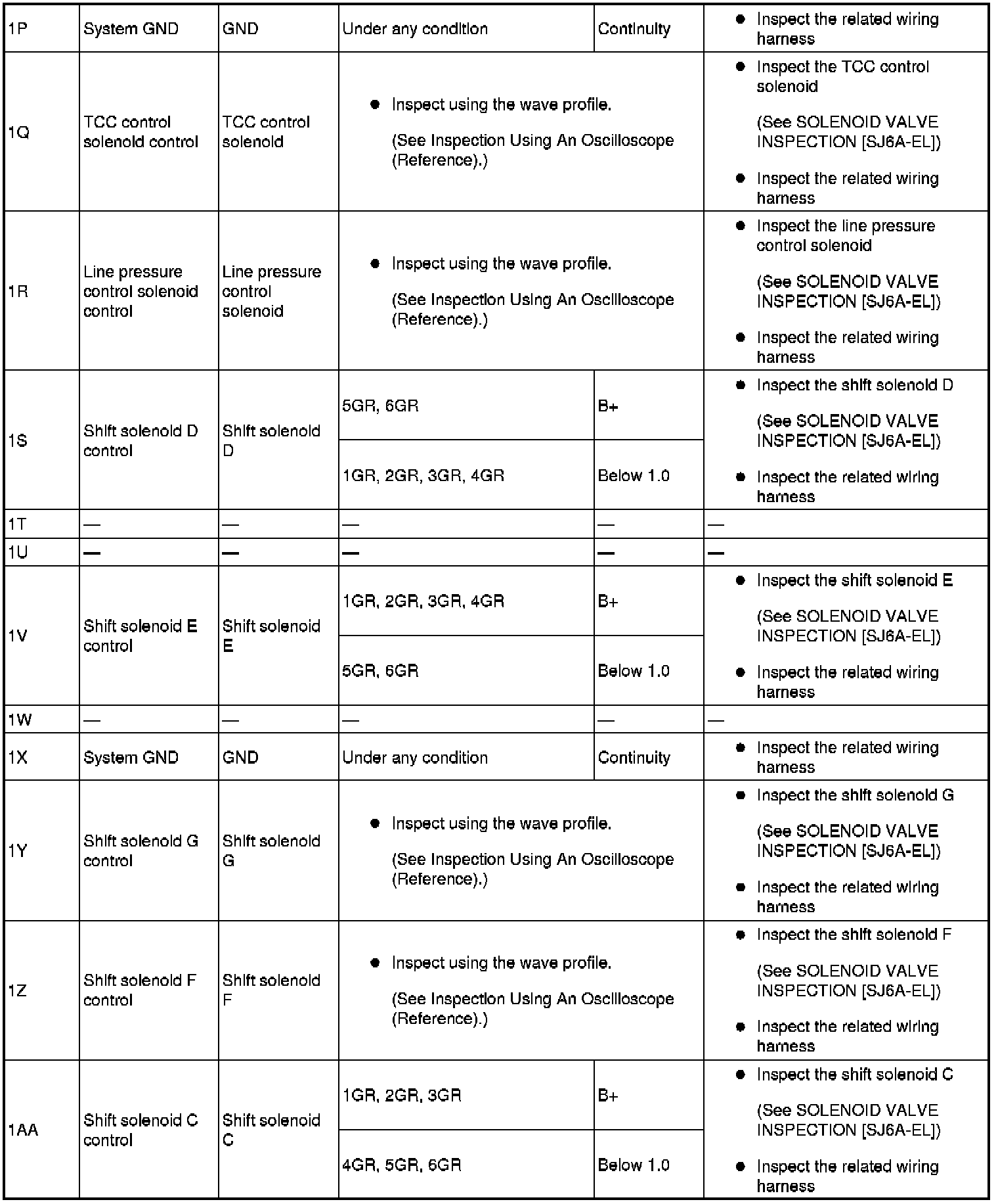 - Use the ground of terminal 1P and 1X of the TCM when measuring terminal voltage, as an error may occur when connecting the negative circuit tester to ground.