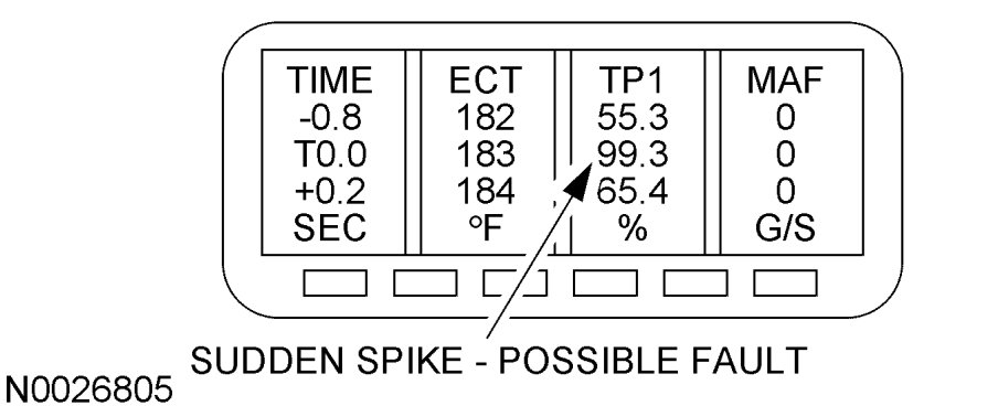 Scroll through the PID data while analyzing the information. Look for sudden drops or spikes in the values. (Refer to the following TP1 example). Notice the major jump in the TP1 voltage while scrolling through the information. This example would require a smooth and progressive accelerator pedal travel during a key on and engine off mode.