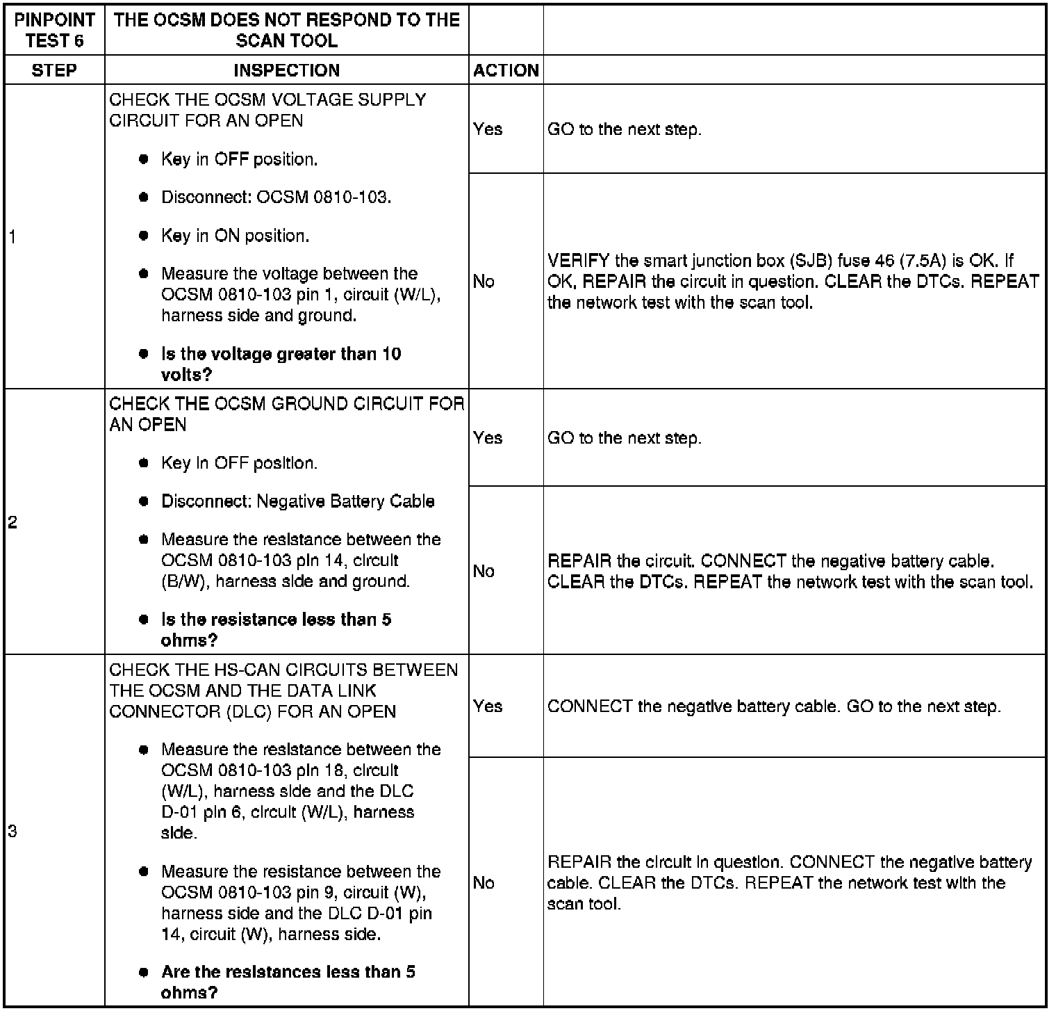 PINPOINT TEST 6: THE OCCUPANT CLASSIFICATION SENSOR MODULE (OCSM) DOES NOT RESPOND TO THE SCAN TOOL