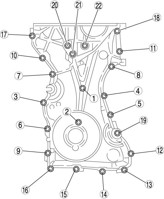 Install the engine front cover bolts in the order as shown.