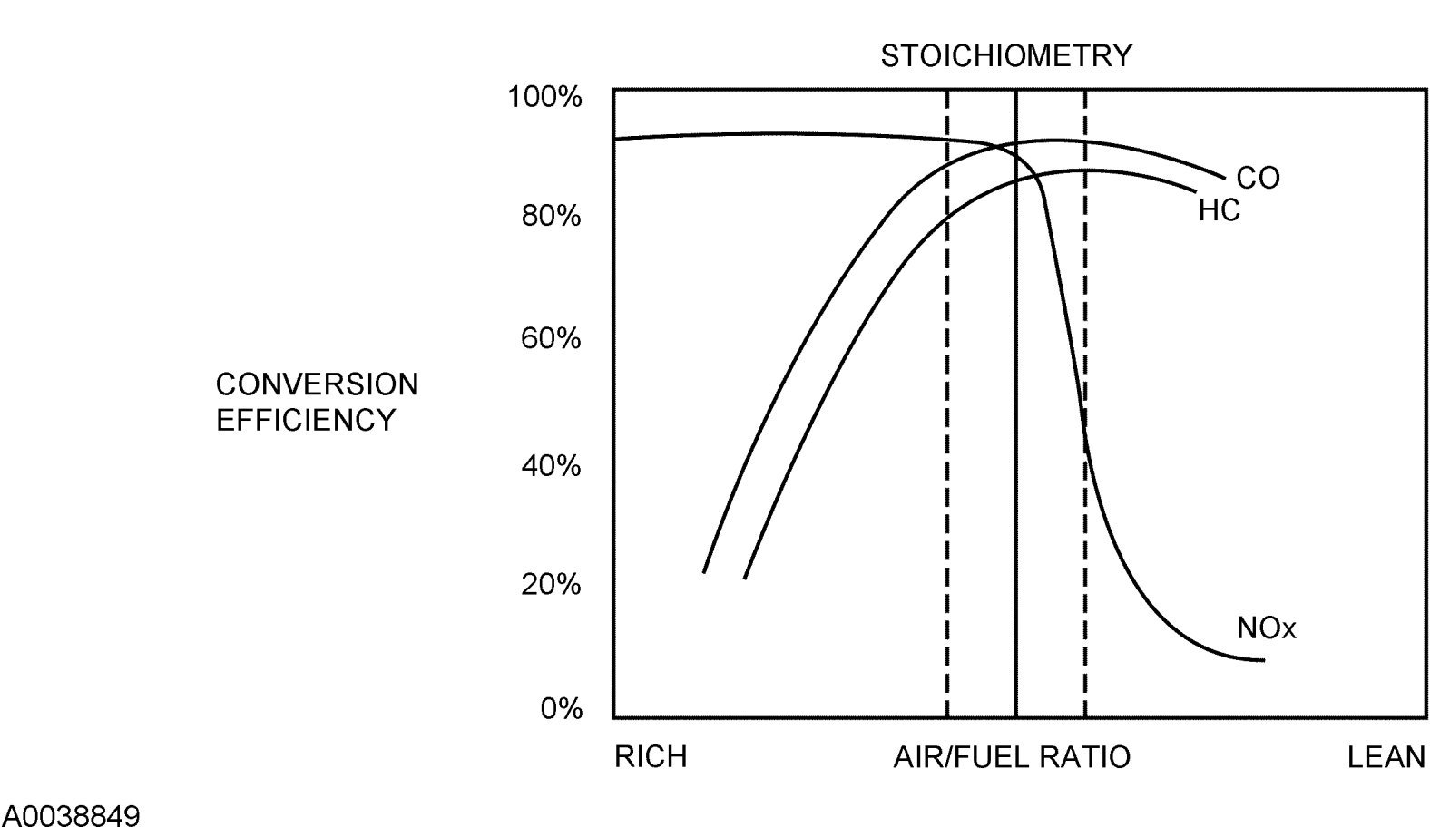 A TWC requires a stoichiometric fuel ratio, 14.7 pounds of air to 1 pound of fuel (14.7:1), for high conversion efficiency. In order to achieve these high efficiencies, the air/fuel ratio must be tightly controlled with a narrow window of stoichiometry. Deviations outside of this window greatly decrease the conversion efficiency. For example a rich mixture decreases the HC and CO conversion efficiency while a lean mixture decreases the NOx conversion efficiency.